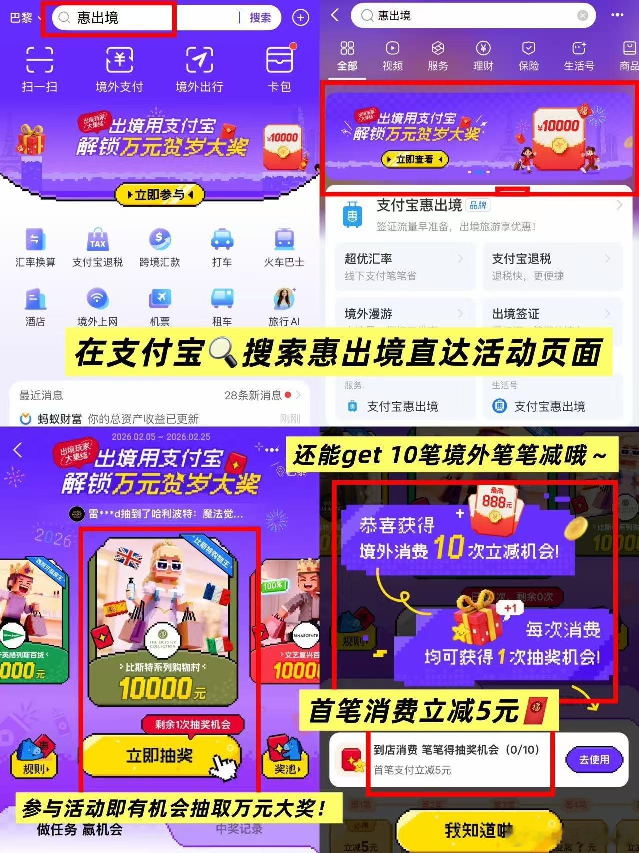 出境被支付宝万元大奖狠狠宠爱去香港旅游的姐妹直接抄作业!zfb🔍「惠出境」,万元出境游大奖真的有人中!优惠超多,活动到2月25日,随手一搜就能省,赶紧码住!支付宝万元大奖开启魔法出境游