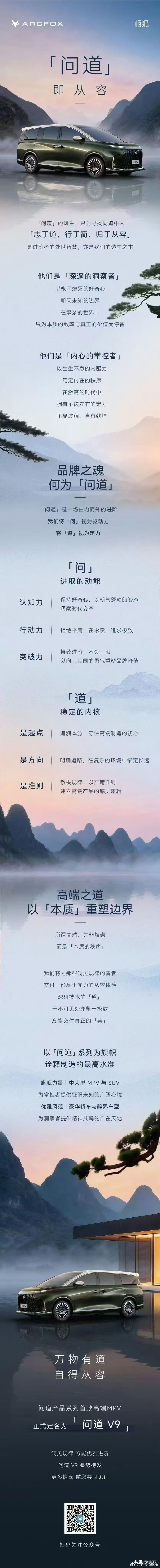孙少军:北汽极狐的MVP,名字出来了,叫做问道! 就在刚才,北汽极狐放出了他们全新的MPV造型以及新的名字,整体来看,这个车是一个大型的MPV无论是造型还是尺寸,看起来都非常的饱满,而且配上这种浅绿色,给人一种很敦实的感觉! 当然,这一次他们专门用了很长的篇幅解释为什么取这个名字,基本上90%的文字都在说一些比较传统文化的东西,比如关于道的,最后才是给这个车的定位,那就是,这个车应该是他们北汽极狐,这么久以来一款真正的高端MPV。 所以无论是软件还是硬件,还是人体的配置,他们应该都配的差不多了,接下来就要看他最终的价格怎么样,毕竟这个类型里面,同行的竞品犬多了,想要脱颖而出,真的需要点真东西和不一样的价格才行。