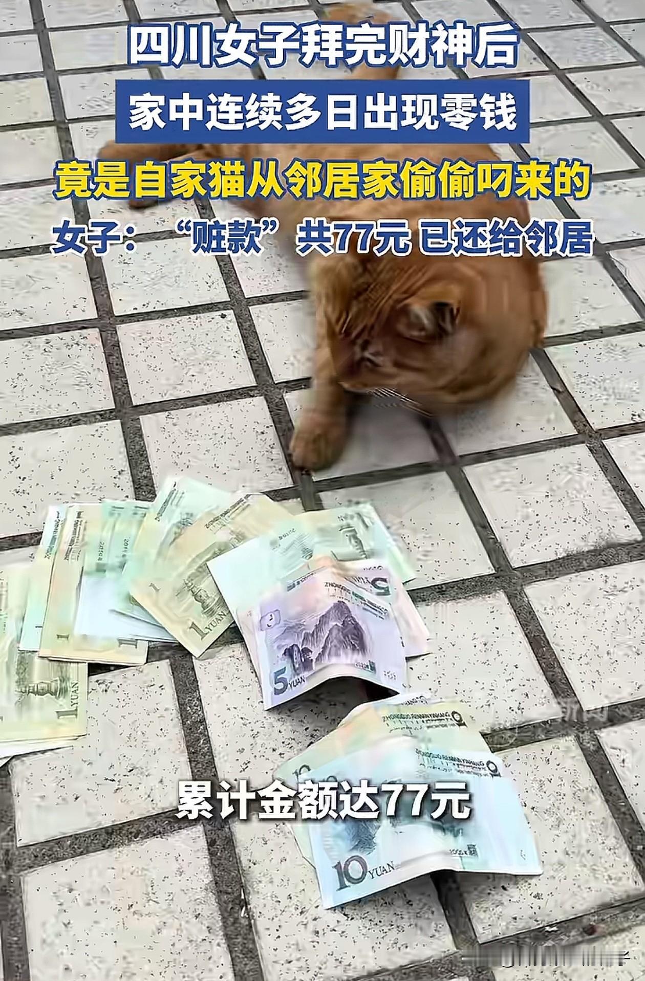 太灵了!四川一女子刚去拜完财神庙,第2天就发现家里多了些零钱,女子本以为是她不小心掉的,可接下来连着几天,都会莫名的出现零钱,女子觉得很神奇,难道真是财神爷在保佑。 她好奇的查看监控后,才发现原来是自家猫咪干的,一到晚上,猫咪就会跑去邻居家叼钱,然后放在自家的楼顶,几天时间一共叼了77块,女子已经把钱归还,并向邻居道歉。 有网友说,这不是你自己让财神爷保佑的,真保佑你了,你又不乐意[捂脸]。 还有网友说,他去旅游到各地,都会去拜当地的寺庙财神,拜了那么多次,为什么没有得到钱?估计是心不诚! 还有网友说,应该学习孟母三迁,带着小猫搬家,去找几个富有的邻居。