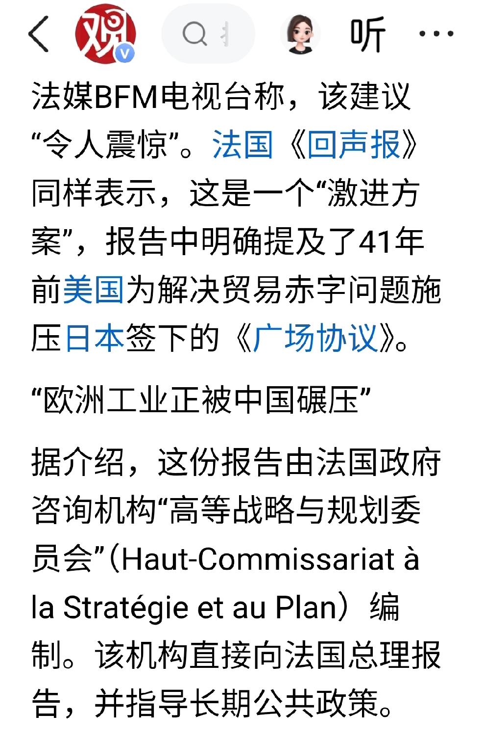 2月10日,观察者网发文:“法国政府报告呼吁,对中国搞个“广场协议”。” 个人认为:法国的这份政府报告,可以理解为“投降书,一份代表欧盟全体的工业投降书” 你有什么资格向美国学习?可不要学习美式霸权霸凌,因为欧洲根本没有这个资格,没有这个能力。 从另一个角度讲,WTO贸易协定,这是西方世界搞出的一份全球协议,难道自己主导的协议,自己要求摧毁吗? 市场竞争不过就要耍无赖,使下三滥手段,难道以为中国企业好欺负吗?