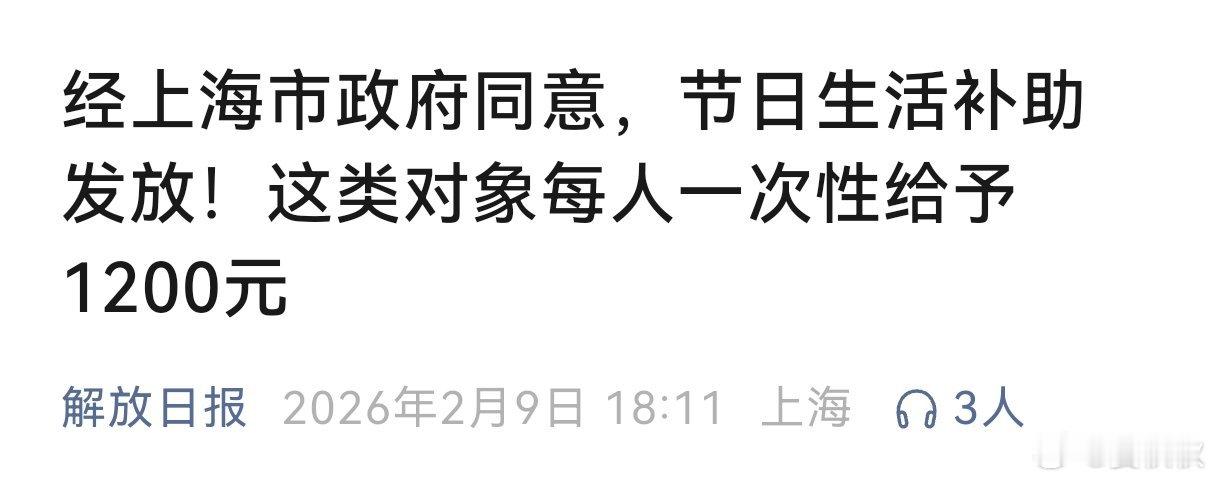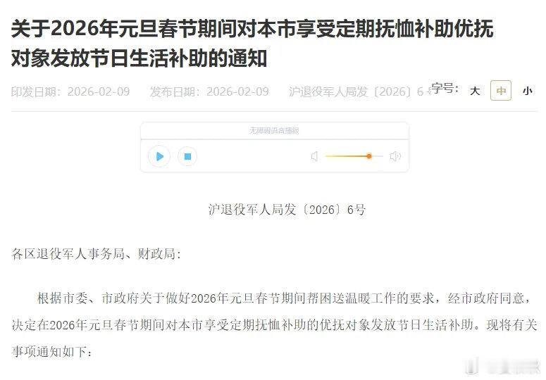 昨天,有不少上海市民,看到了上海市政府网站上的一则《通知》,说的是上海市政府决定在2026年元旦春节期间,为特定群体发放一笔节日补助,每人1200元。不少人在直播间问,这个钱是发给谁的。让我们来看一看《通知》,这1200元,是发给“本市享受定期抚恤补助的优抚对象”的。“优抚对象”是谁?通俗地说,指为国家国防和军队建设做出过贡献的军人及其家属。具体包括:革命烈士、因公牺牲军人、病故军人的遗属(如父母、配偶、子女等)。现役军人及其家属。伤残军人。复员军人和退伍军人。但是,并不是所有上述人群,都能自动获得这次补助,前提是“享受定期抚恤补助”。也就是说,他们必须正在长期、按月从政府领取一笔固定的抚恤金或生活补助金。而这次春节的1200元,是在这笔固定补贴之外,额外发放的节日慰问金。这一次补助,每人一次性发放1200元,春节前发到位。如果有人同时符合其他政府部门(如民政局、人社局)的春节补助条件,只能领取标准最高的那一份,不能重复领取。节日生活补助上海晏秋秋本地新闻
