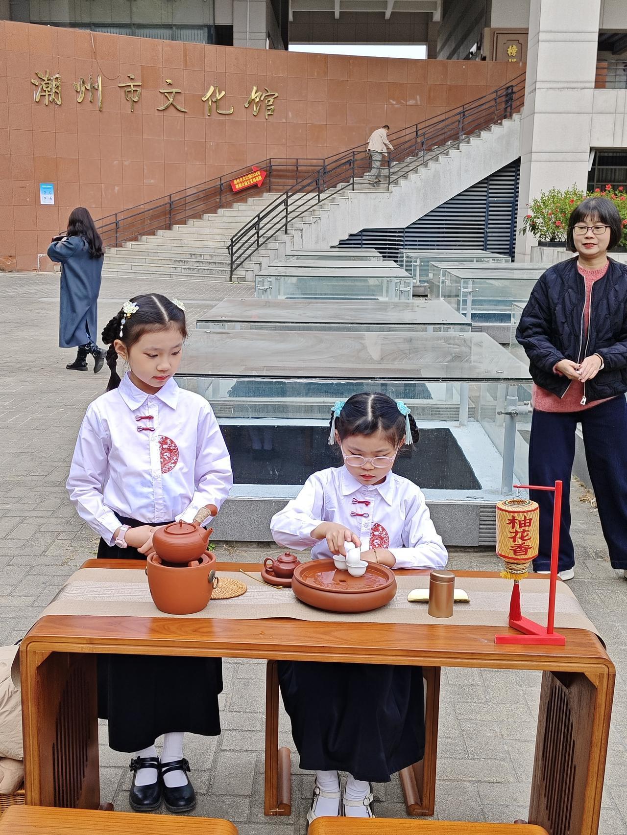 今日上午,潮州市文化馆于人民广场举办了非遗传承活动,活动项目涵盖工夫茶、木雕、潮