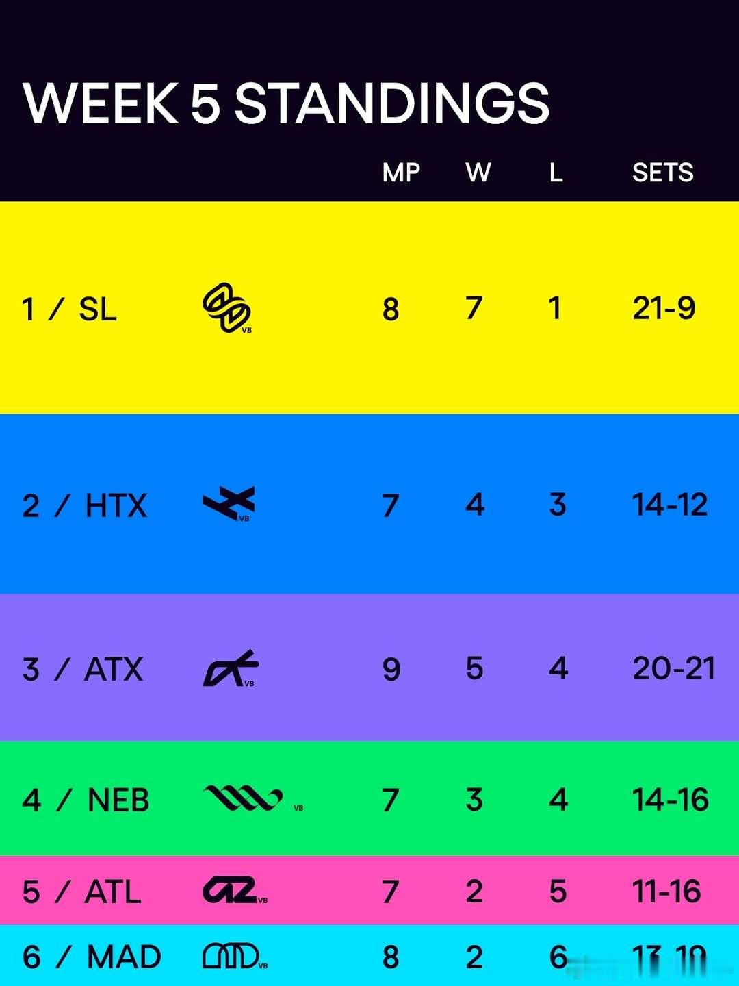 龚翔宇留洋第一季 ⚔️ LOVB第二季第5周结束后,各队积分排名👇。波尔特领衔的盐湖城队首场输给麦迪逊后迎来了7连胜并领跑积分榜,而龚翔宇所在麦迪逊队开启2连胜后遭遇了6连败、暂时排名垫底。蓝衣军团需快速调整状态,打出翻身仗以提振团队士气。继续加油吧!