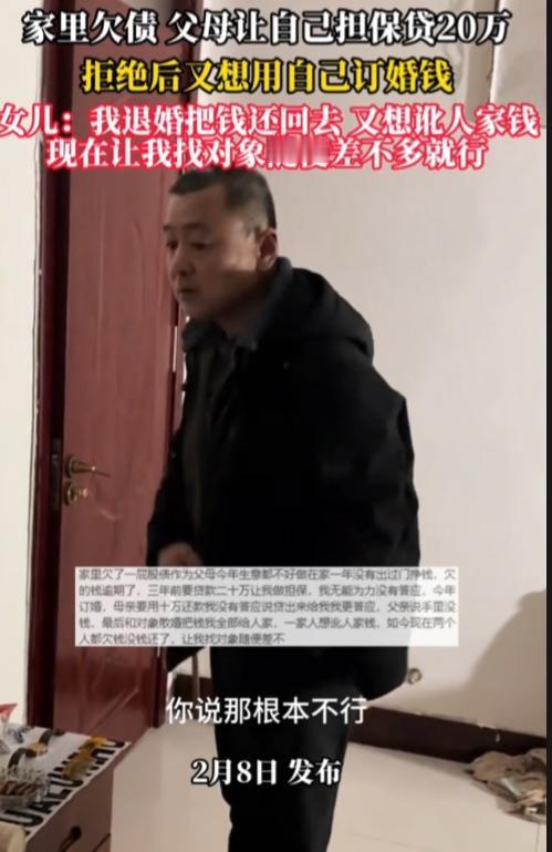 原生家庭的悲哀,真让人窒息! 家里欠债,父母让女儿担保贷20万,遭拒绝后又开始打女儿彩礼的主意。见上一段吹了,女儿退还彩礼,父母讹不成,就催促女儿赶紧找对象。 “你自己心里有数,人家一给你提一给你说,这个你自己心里得有个数。你别一问这一问那,你看看这女的行吗,要行都给人家啥,不行就拉倒。你说达不到你的,达不到你的啥都散伙。” 父亲连说话都不敢直视女子眼睛,却能理直气壮教女儿挑对象,句句不说彩礼,但句句要女儿按彩礼要求找对象。 这是女儿吗?这是把女儿当做血包,一家人趴在女儿身上吸血,甚至把女儿的幸福当做生意。除了算计,还是算计,毫无亲情可言。 原生家庭的悲哀,真让人窒息!逃又逃不掉,躲又躲不过。难得是,女儿仍三观端正,这出淤泥而不染的品质,难能可贵!希望她能早日摆脱这吸血父母,觅得真爱!