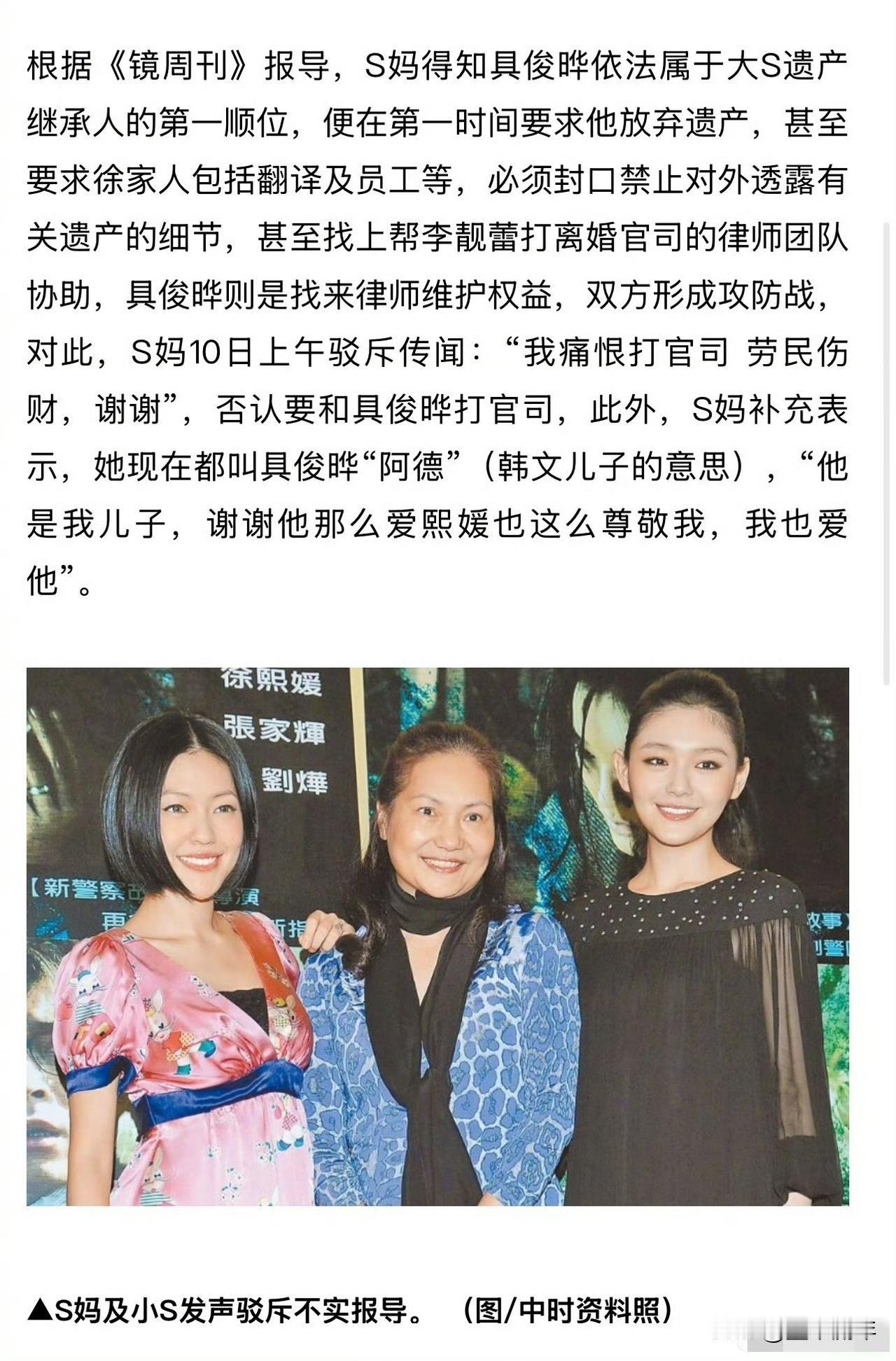 传S妈要跟具俊晔争那10亿遗产?结果S妈直接出来打脸了,说自己最痛恨打官司,劳民伤财的事儿她才不干。还说现在都叫具俊晔“阿德”,韩文里就是儿子的意思,“他是我儿子,谢谢他那么爱熙媛,也这么尊敬我,我也爱他。”这话听着,哪儿像要争遗产的样子啊,分明是把女婿当亲儿子疼。 到底是媒体捕风捉影,还是家里真有矛盾,现在也说不清楚。不过就S妈这话,至少明面上是把具俊晔当自家人了。