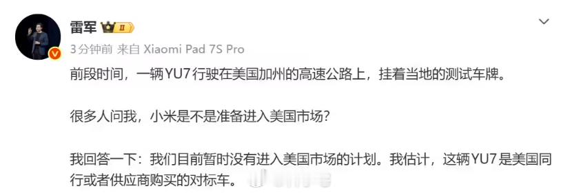 雷军表示:小米汽车目前暂时没有进入美国市场的计划