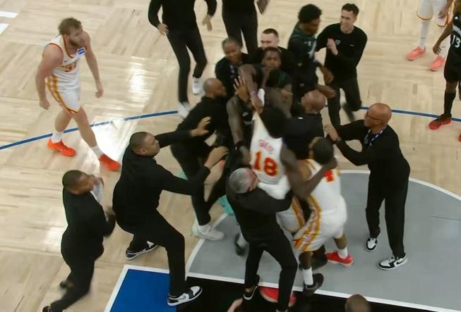今天怎么回事? 老鹰和森林狼也打了一架,里德、盖耶双双驱逐! 活塞和黄蜂是大规模冲突,4人被驱逐,老鹰、森林狼规模小了点,但也是互相抡拳头,上演全武行,在北方的小年这一天,NBA是给球迷包饺子了,看的人热血沸腾。 相比于比赛而言,这样的画面才比较稀罕,对抗型比赛的运动员,需要一些情绪出口,天天四平八稳的打球,容易失去球迷...[抠鼻][奸笑]