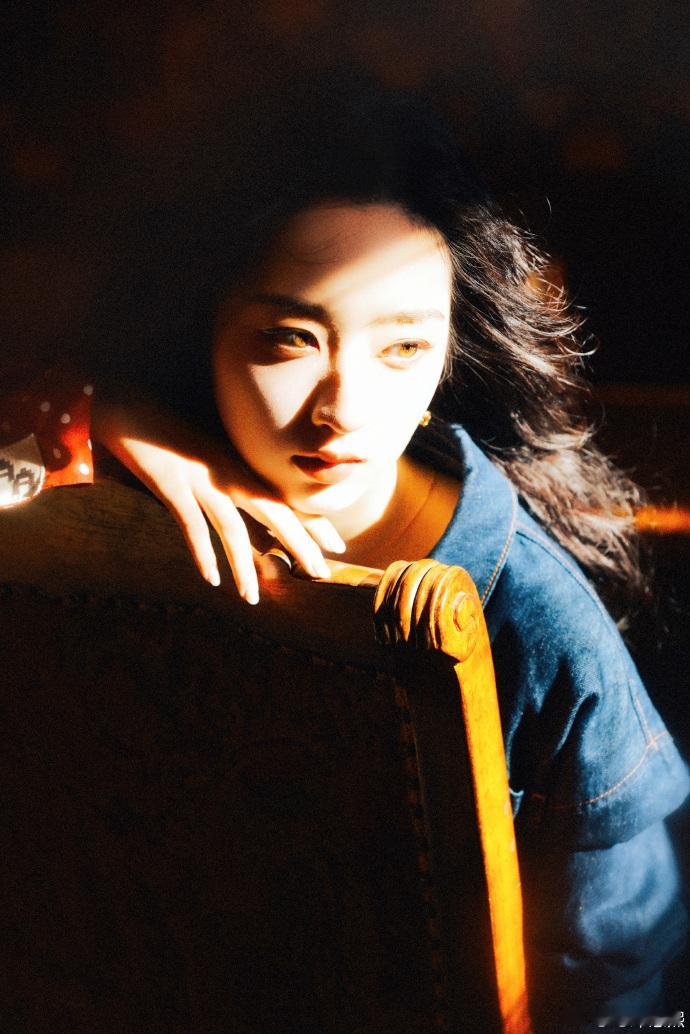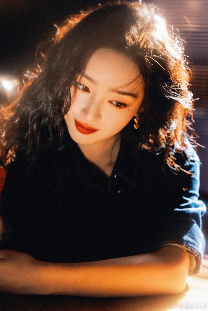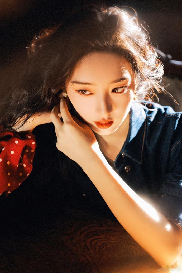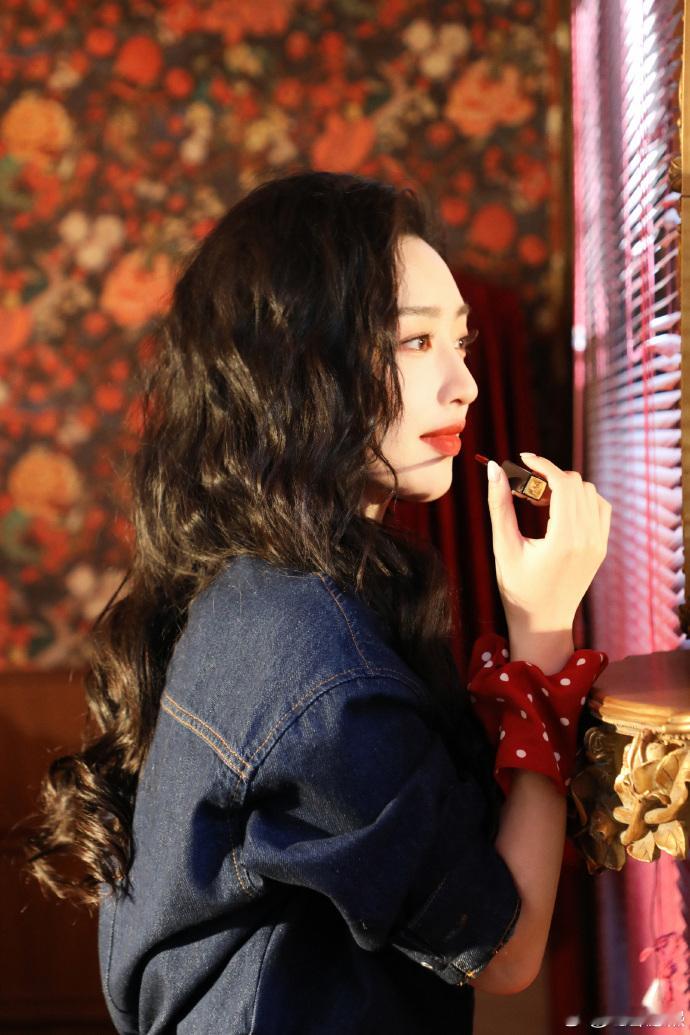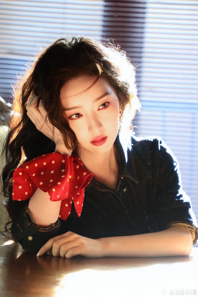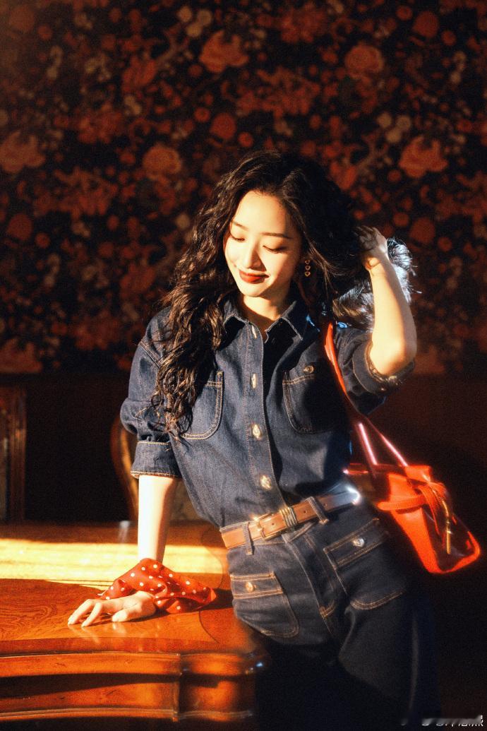 大波浪卷发松松垮垮地搭在肩上,配上复古红唇,一下就有了90年代老电影的氛围感。牛仔套装和波点发饰平衡得刚好,随手一截都是旧画报女主既视感!