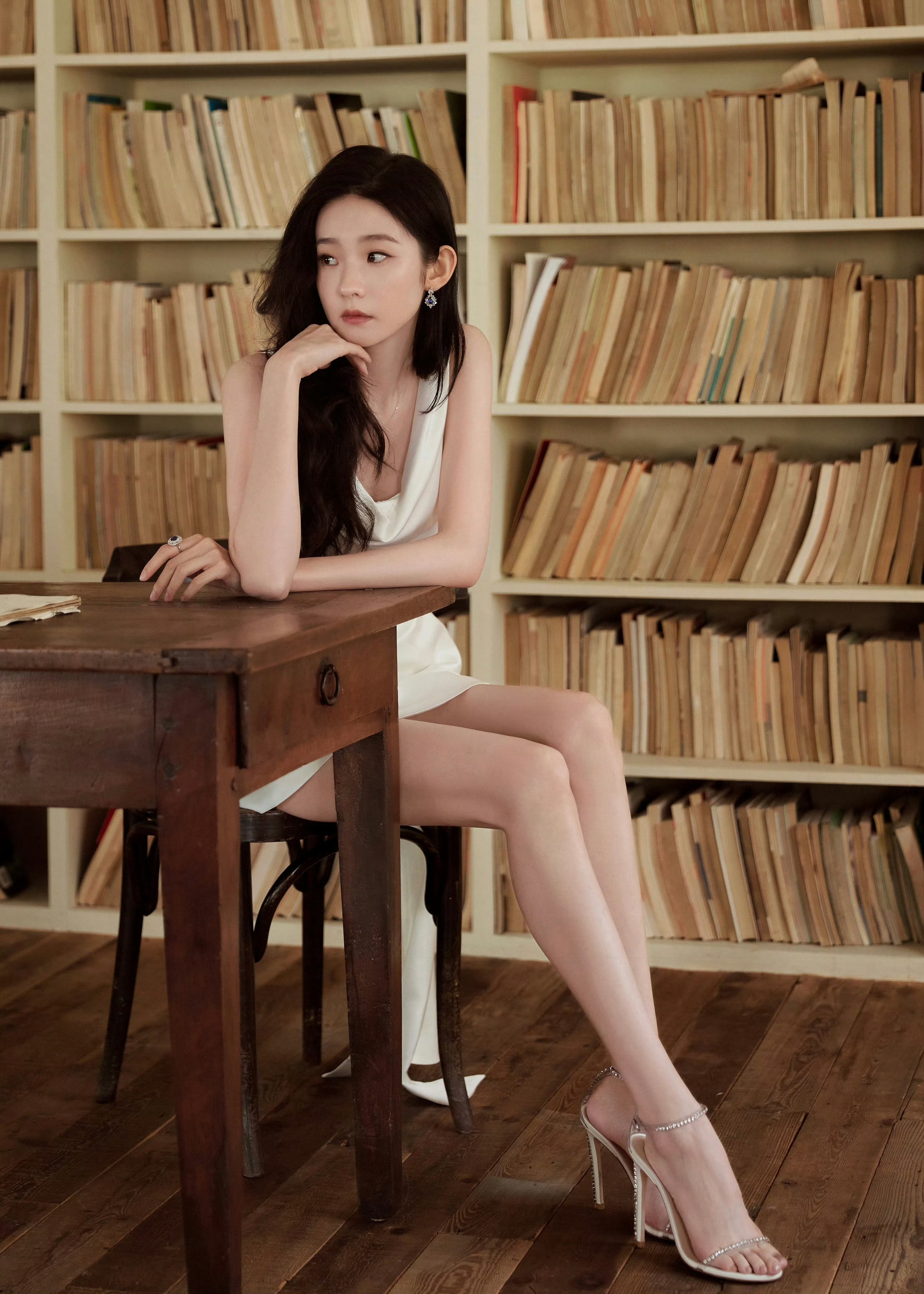 优雅黑发美人,书香四溢的静谧时光黑发红唇女神古典红裙佳人黑发女神黑发辣妹