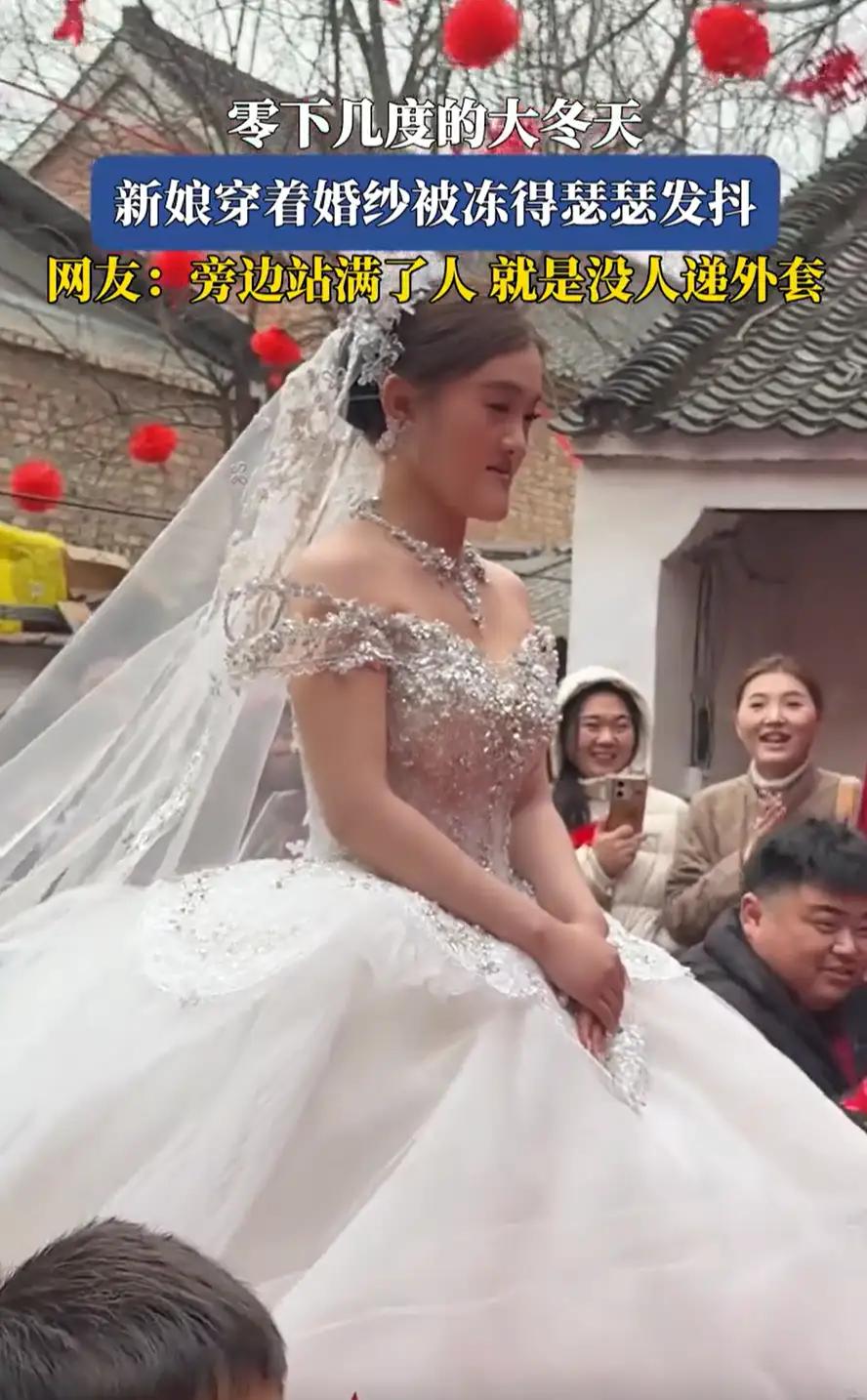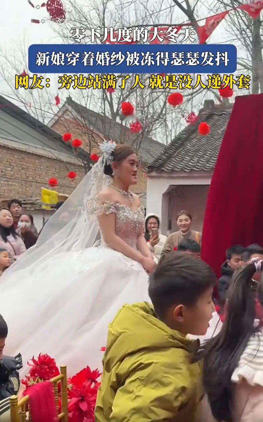 河南,一对新人结婚,不过因为条件有限,结婚的地点并没有选在室内酒店,而是零下十几度的户外,新娘穿着婚纱,露着肩膀冻到发抖,让人看的心疼,网友:旁边站满了人却没人递外套! 婚礼当天,户外气温极低,寒风呼啸,新娘身着洁白却单薄的露肩婚纱,在冷风中显得格外单薄。她裸露的肩膀被冻得通红,身体不受控制地微微发抖,嘴唇也冻得发紫,却依旧努力保持着微笑,坚持完成婚礼的每一个环节。 令人唏嘘的是,婚礼现场并非无人陪伴,新郎、双方亲友、朋友围满了四周,人来人往十分热闹,可却没有一个人及时上前,为冻得发抖的新娘递上一件外套,大家似乎都沉浸在婚礼的流程与喜庆之中。 网友:“结婚是一辈子的大事,再简陋也不能让新娘受这份罪”“旁边站了那么多人,递一件外套只是举手之劳,看着太让人心酸了”。也有网友感慨,婚礼的意义不在于场地是否豪华、仪式是否隆重,而在于身边人的在乎与呵护,一件小小的外套,藏着的是最直接的温暖与心意。 寒冬虽冷,人心该暖。一场简单的婚礼,应充满爱意与温暖,都能在最重要的时刻,被温柔以待,被细心呵护,不让寒冷冲淡了本该属于她的幸福与体面。