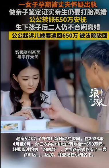 一对夫妻和他们的公公,整个事件围绕着信任、金钱与情感纠葛展开,情节跌宕起伏,令人唏嘘不已。 小唐和小谢登记结婚后,小谢很快怀孕,这本是全家欢喜的好事,可小唐却在这时暴露出诸多问题。他不仅隐瞒了自己的婚史,还在小谢孕期毫无根据地多次怀疑胎儿不是自己亲生的,甚至不顾小谢作为孕妇的身体和心理状况,执意要求做亲子鉴定。对小谢来说,这无疑是巨大的精神羞辱,仿佛自己的忠诚和人格被全盘否定。但为了自证清白,小谢强忍着委屈配合做了鉴定,结果白纸黑字证明孩子确系小唐亲生。 本以为真相大白后,小唐会感到愧疚并努力修复关系,可他的态度却依旧冷漠,甚至坚持要求小谢打掉孩子并离婚。小谢心寒至极,情绪崩溃,直接提出了打胎离婚的想法。就在这个关键时刻,公公老唐出场了。他或许是想保住即将出生的孙子,或许是想平息这场家庭风波,在2023年4月至6月期间,分三次向小谢转账共计650万元,还特意备注是“购房款”。小谢用这笔钱在上海徐汇区购买了一套学区房,并单独登记在自己名下。 孩子出生后,夫妻感情不仅没有好转,反而彻底破裂,两人开始分居。小谢起诉离婚,不过可能因为处于哺乳期限制或者财产分割存在争议,离婚诉求并未得到支持。而这时,公公老唐的态度却来了个一百八十度大转弯。他拿着儿子小唐单方签署的借条,以“借款”为由,将儿子和儿媳一起告上法庭,要求他们共同偿还这650万元及利息,还声称小谢曾以打胎要挟借款。 然而,法院在审理后认为,借贷关系并不成立。因为借条上只有小唐的签名,没有小谢的签字或追认记录,无法证明小谢知晓并同意这笔借款。而且,转账备注是“购房款”,资金直接进入了小谢的账户,房产也单独登记在小谢名下,这些行为都指向这笔钱更可能是赠与,而非借款。最终,法院驳回了老唐的全部诉求。 这起事件中,小唐的猜忌和不负责任,老唐最初想用金钱解决问题却反悔追讨的行为,都让人看到了这个家庭在信任和情感方面的缺失。而法院的判决,也给所有家庭敲响了警钟,在处理家庭矛盾和财产问题时,一定要理性且合法,否则可能人财两失。 来源:海报新闻