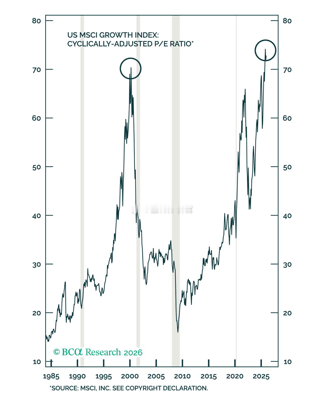 BCA:“美国成长股指数的周期性调整市盈率目前已超过70倍,达到了与2000年互联网泡沫顶峰时期相当的水平”美股