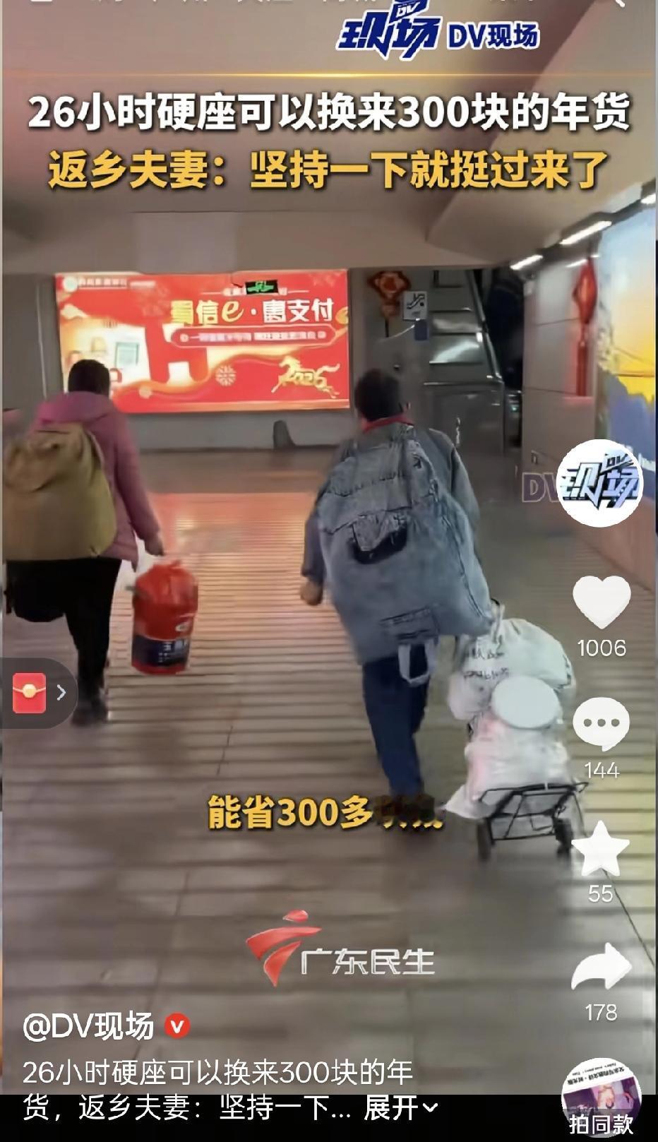 春节,是中国人的心中重要的节日,无论身处多远,都要赶回去,为的就是可以和家人一起团聚。 身在外省打拼的老夫妻,过年要回老家,宁愿要坐二十几个小时的硬座火车,也不愿意买上一张卧铺票,舒舒服服躺着回家。 一问为什么,他们就说,挣钱不容易,花钱买舒服没必要,拿这省下的300块路费,可以买好多年货了。 也许这对老夫妻缩影,就是我们千千万万的父母真实写照。我们也长大了,听到看到这种事情很心酸,父母在外打工都不容易,过年回来的子女,都好好孝敬你们的父母吧。