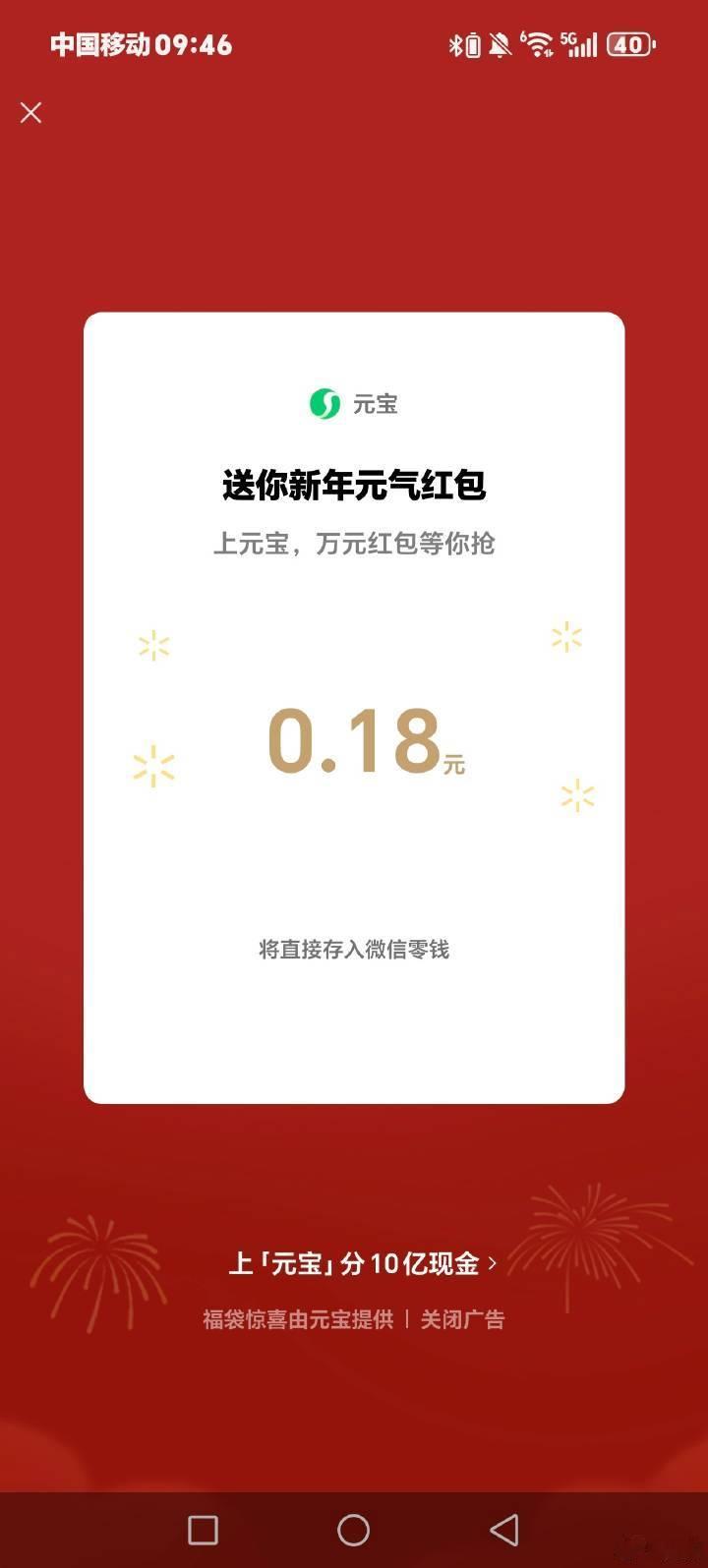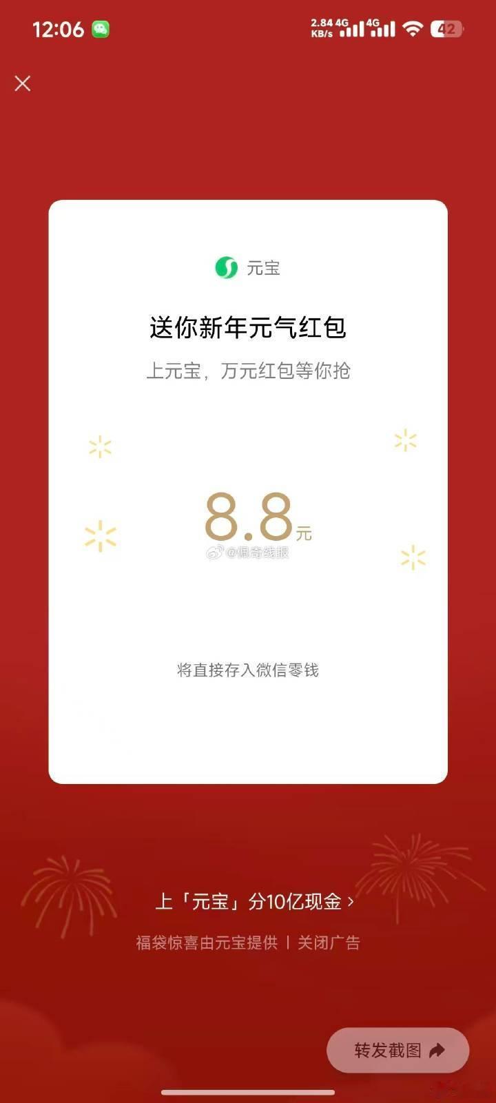 元宝微信发红包微信聊天发“元宝”两个字能领红包,目前看到最大的红包是68!