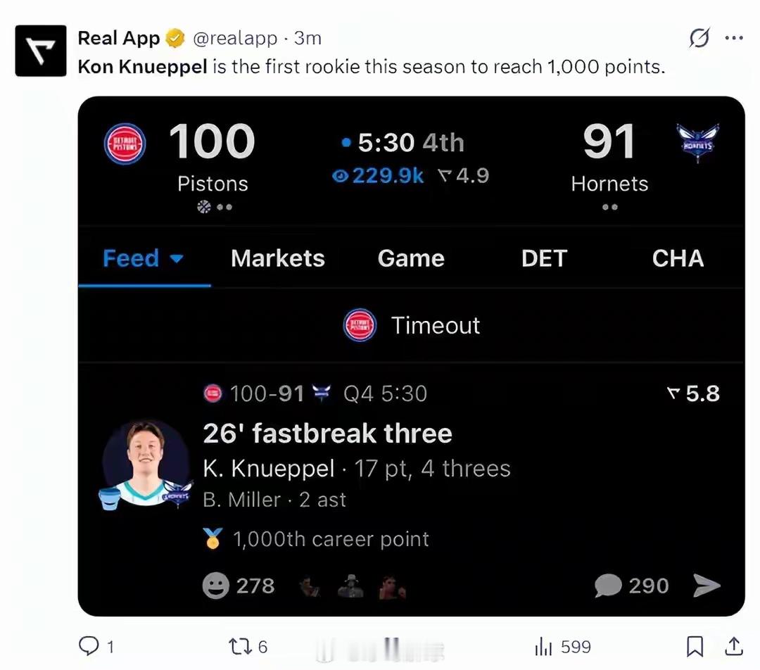 黄蜂新秀克努佩尔对阵活塞砍下20分5篮板3助攻,命中5记三分,生涯总分突破1000分,成为本届最快达成该里程碑的新秀。