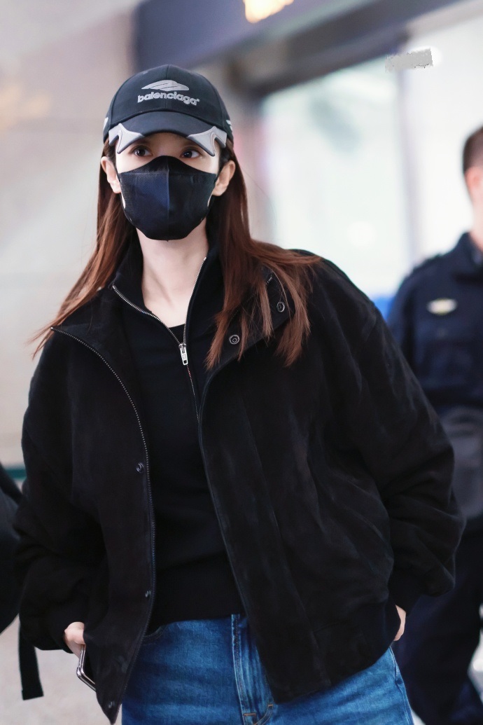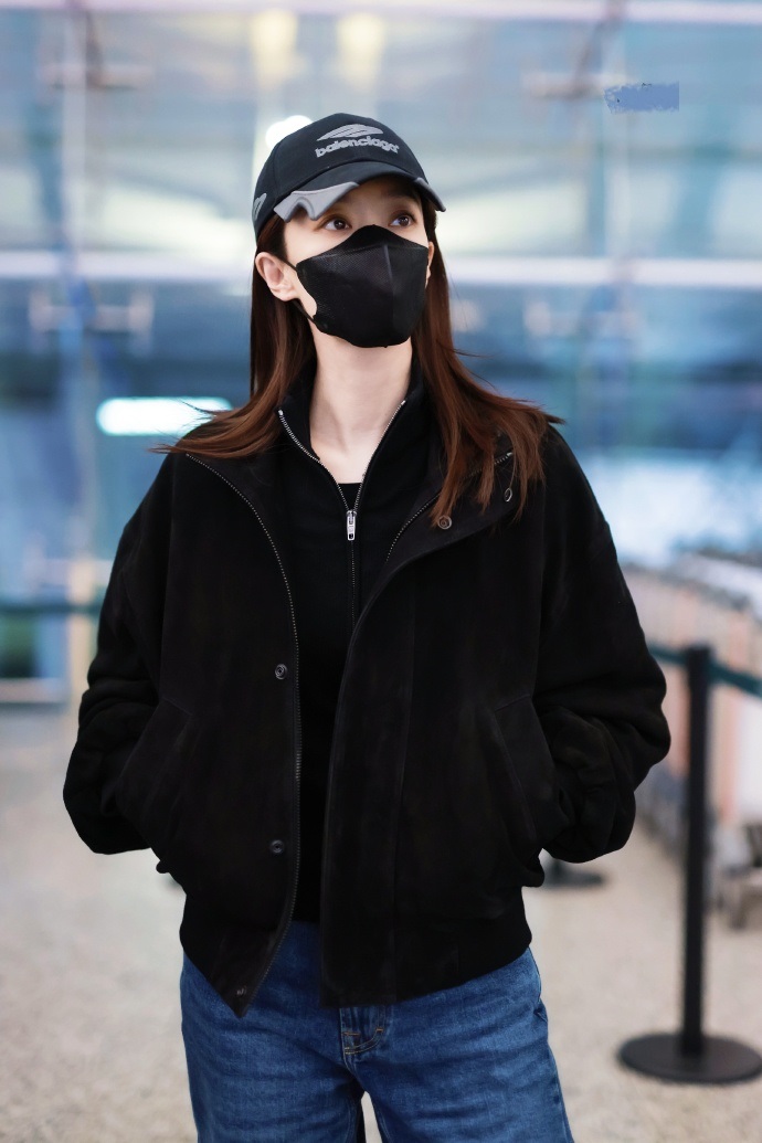 张小斐里面穿黑色针织衫,外面套装黑色绒面外套,两件衣服叠穿起来效果很不错