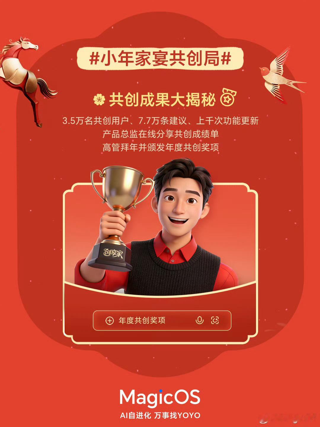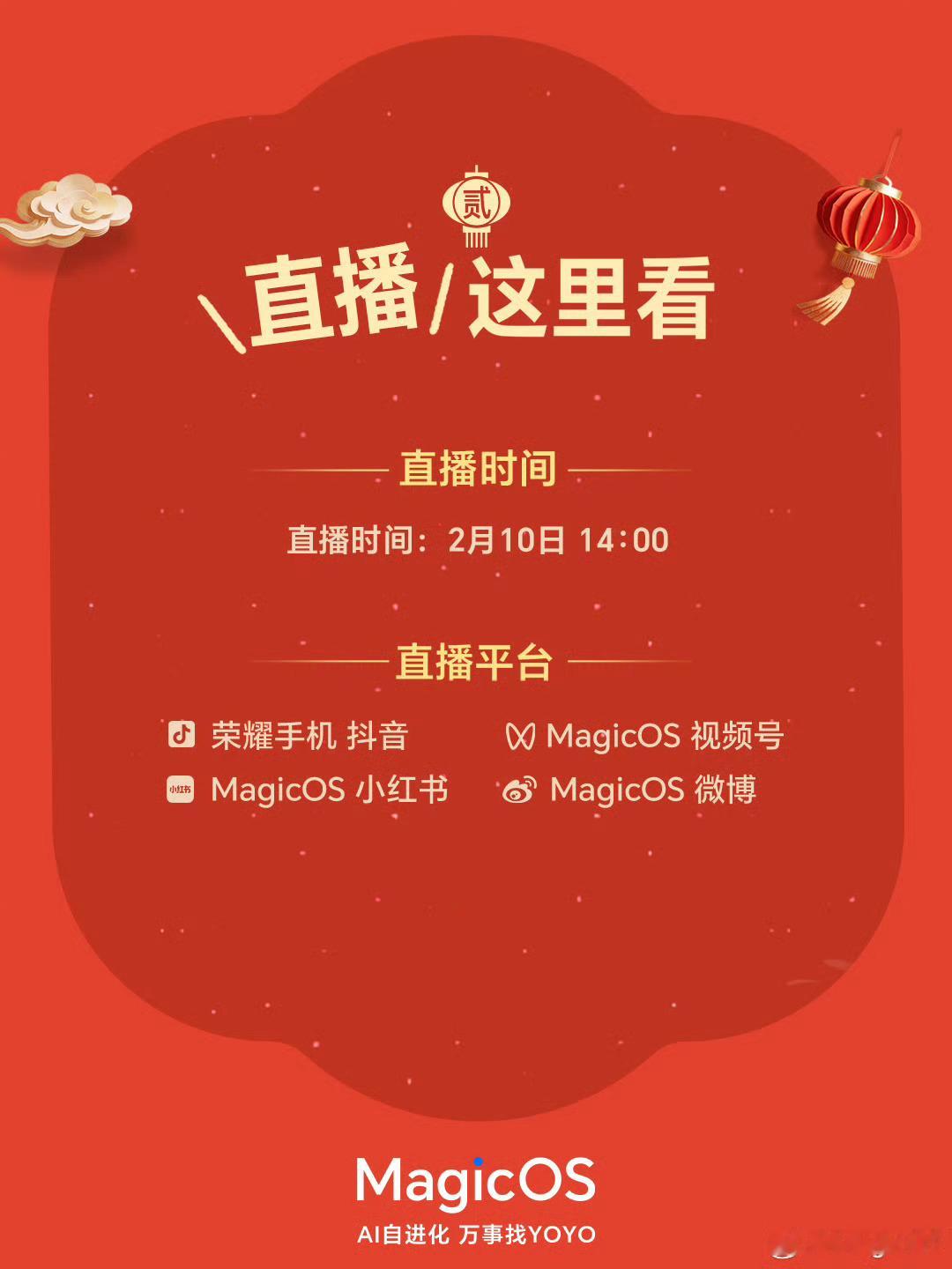 荣耀MagicOS新年荣耀ai到福到 小年赴家宴,MagicOS邀你畅聊迎新年!2月10日14:00,锁定MagicOS视频号/微博/小红书直播间,参与荣耀创享家小年家宴,互动赢荣耀好礼!