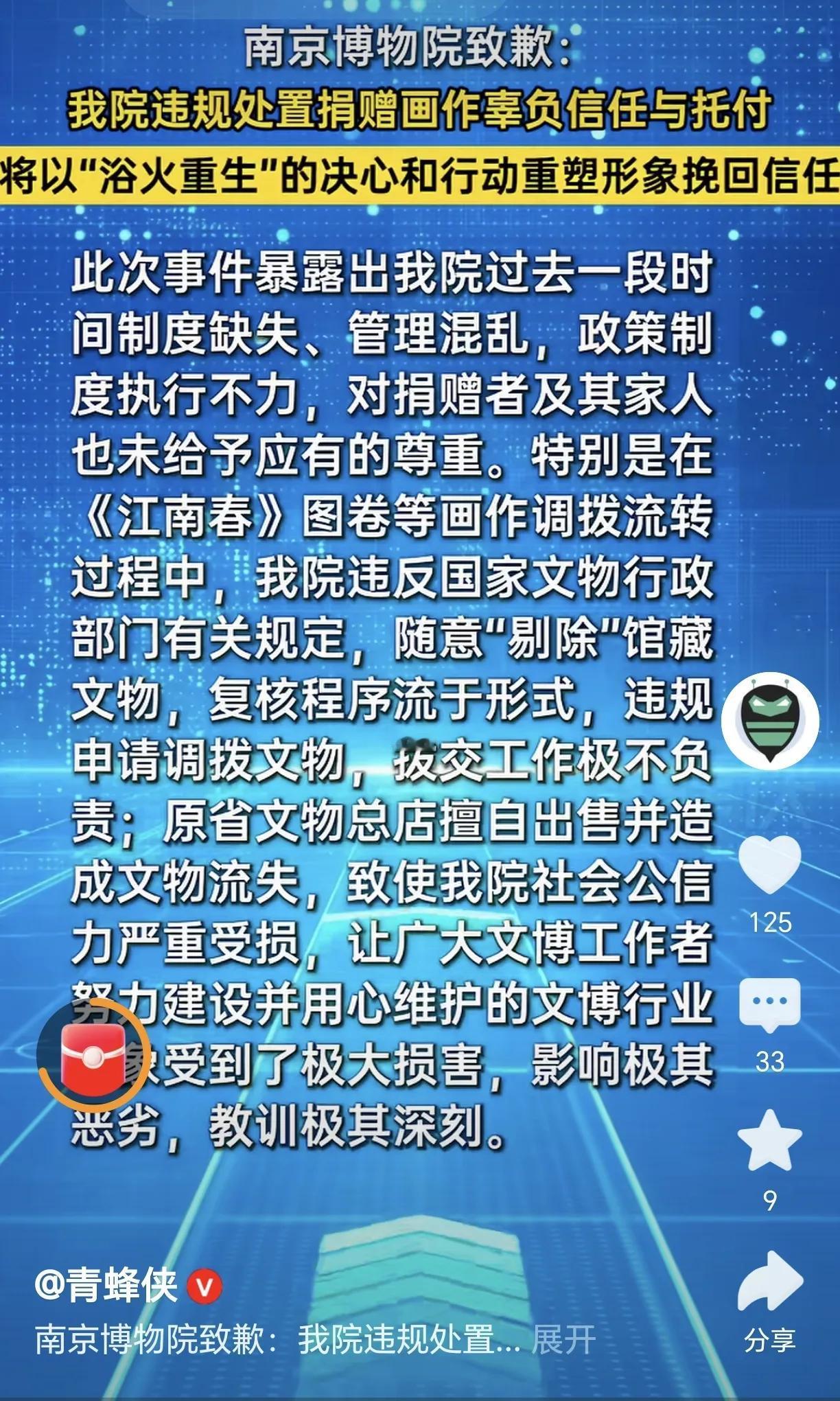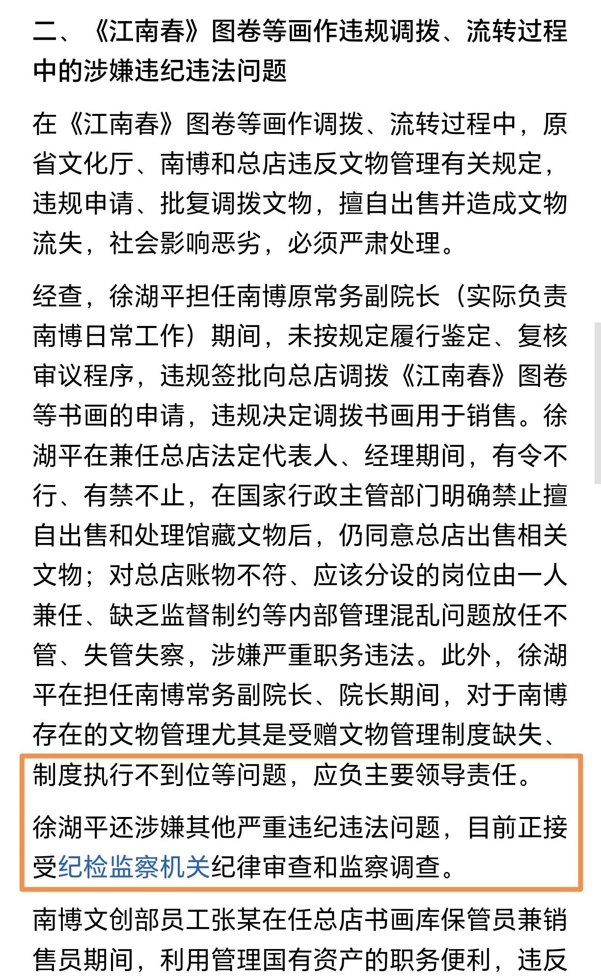 南京博物院《江南春》等5幅画作事件的调查通报出来了。 调查组走访调查取证后,确认了画作确实被违规调拨流出。徐湖平负领导责任,还涉嫌其他问题在被调查;同时被调查出的有关人员29人,除了5人已经去世、不再处理外,对剩余24人依法查处、涉及犯罪的移送司法机关。 重点:江苏省政府已经责成行政管理部门对南博有关问题行政立案。说除了违纪违规问题要处理,对违法犯罪问题也要立案调查再依法处理。 也就是说事情目前还没有完全调查清楚,但以南京博物院的在国内文博系统的地位,出现这样的丑闻,已经足够击穿大众对全国文博系统的信任。 这不是偶然的独立案件,而是涉及到系统性腐败犯罪链条的文物犯罪大案,即使没有彻底查清,已让国人不再相信文博系统和各种文物字画专家。 南京博物馆拍卖 南博江南春争议 南博画作争议