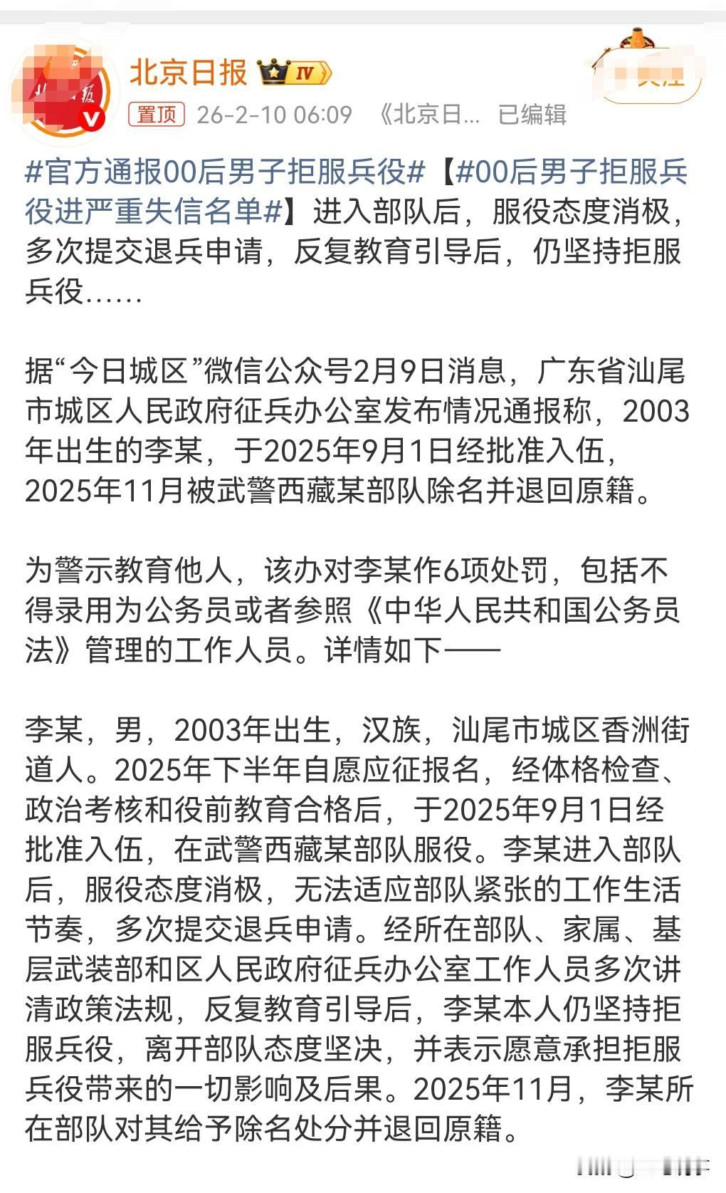 一人当兵,全家光荣,想不到有人竟然还逃兵役,这是愚蠢至极呀。 当兵不是儿戏,逃兵役后果很严重,吃不了苦就不要去当兵。 但是一旦去了,就一定要坚持到底,绝不能当逃兵。 2月10日热点,00后男子拒服兵役进严重失信名单,他得到了逃兵役该付的代价。 被罚款近3万,不得当公务员,而且户口本上永久写上拒服兵役几个字。 当然还有一些惩罚。