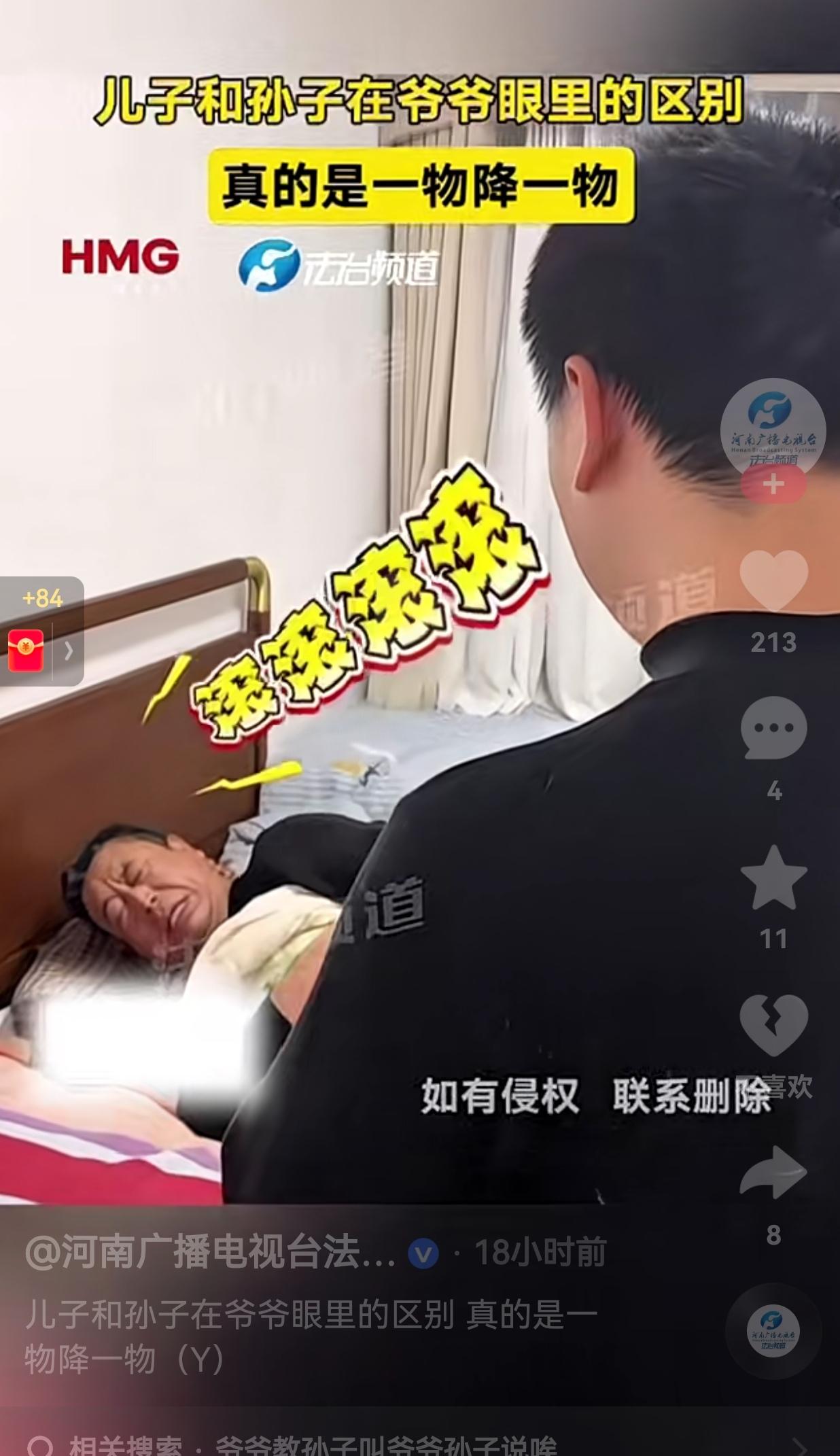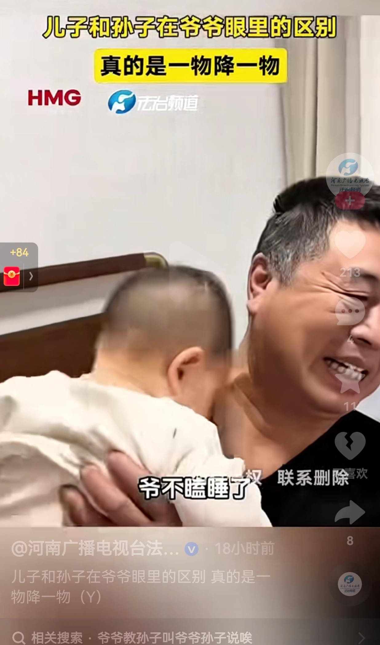 果然,大孙子能治瞌睡!老爸困意上来了,于是,躺在床上,就大睡一觉。 儿子也是没有眼力见,看到老爸睡着了,竟然直接凑到床边喊:“爸,起来吧别睡了。” 老爷子眼睛都没睁,皱着眉挥手:“滚滚滚滚滚!瞌睡的给啥一样!” 儿子知道老爸的软肋,也没有再说什么,转身抱来还不会走路的小孙子,往爷爷床边一放。 下一秒,老爷子眼睛“唰”地一下就睁开了,一把把孙子搂进怀里,笑得眼睛都眯成了一条缝,嘴里念叨着:“哎,我的大孙子来了!爷爷不睡了。” 刚才还说“瞌睡的给啥一样”,这会儿精神得能去跳广场舞。 网友看到后评论道:“这就是儿子和孙子在爷爷眼里的区别,真的是一物降一物。” 还有的网友共鸣说:“我爸也是这个样子,我叫他起床他骂我,我女儿一喊,他立马弹起来给冲奶粉。” 说实话,我看完第一反应是:这不就是我家吗?我爸平时对我,那叫一个“严格”。我赖床,他直接掀被子。我玩手机,他能念叨半小时。我想多睡会儿,他能在客厅把电视声音开得震天响。 可对我儿子呢?他却明显区别对待。孙子说要吃冰淇淋,他顶着大太阳跑三条街去买。孙子说要骑大马,他趴在地上当牛做马。孙子半夜哭一声,他比谁都跑得快。 我照顾不好他的孙子时,他还反过来骂我:“你怎么当爹的,连个孩子都哄不好?” 我有时候也会“吃醋”,跟我爸抱怨:“爸,你对我咋没这么好?” 我爸白我一眼:“你都多大了,还跟我孙子比?” 后来我才明白,这不是双标,是隔代亲。 他们把对我们的严厉,都化成了对孙辈的温柔。他们吃过的苦、受过的累,不想再让孙子辈受一遍。他们没来得及给我们的宠爱,都一股脑地给了孙子。 这件事情说到底,父母对我们的严厉,是希望我们能在这个世界上站稳脚跟。他们对孙辈特别温柔,是希望他们希望孩子能在爱里长大。 他们的“双标”,不是偏心,而是把两代人的爱,都给了同一个家。 大家觉得呢?欢迎评论区留言。