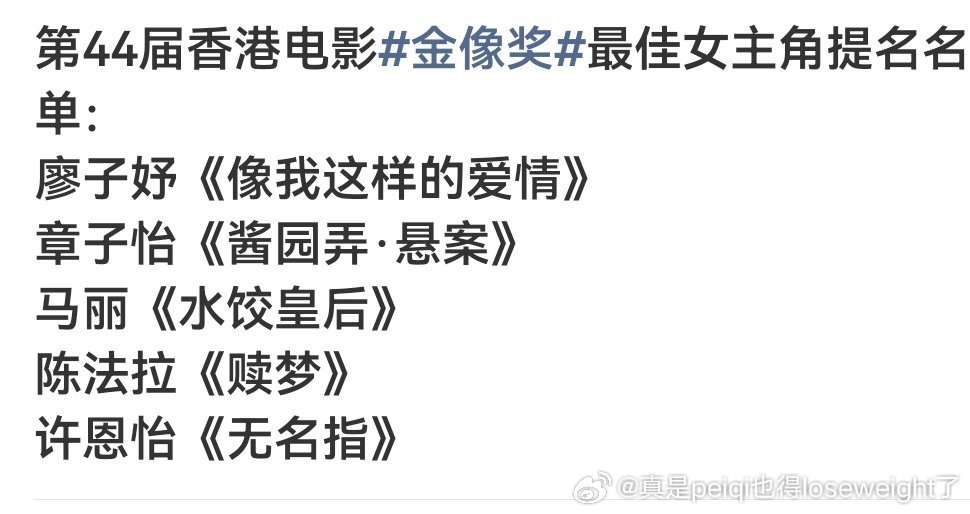 章子怡酱园弄这么烂的片子也能提名也是靠资历了不过给马丽也提了一个,还不错惹