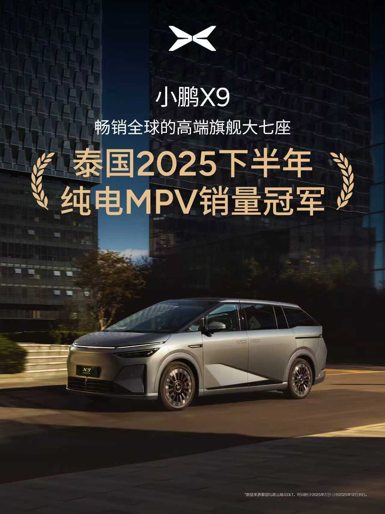 小鹏X9斩获泰国2025下半年纯电MPV销冠!2025年下半年,小鹏X9在泰国累