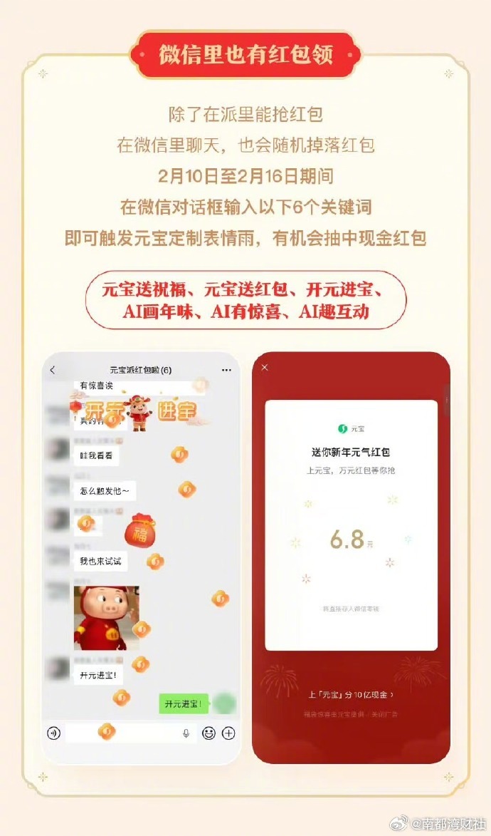 同日,回应称:“除了在派里能抢红包,在微信里聊天也会随机掉落红包,2月10日至2月16日期间,在微信对话框输入以下6个关键词即可触发元宝定制表情雨,有机会抽中现金红包。”#元宝微信发红包#