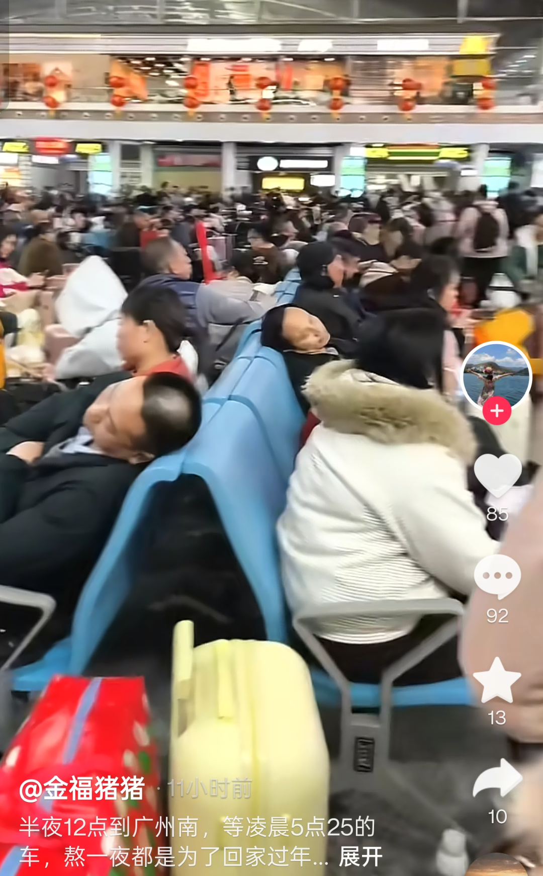 近日,不少网友在社交平台发帖,晚上12点过后,广州南站候车厅里,仍有不少旅客正在候车,等待乘坐春运期间加开的夜间高铁回家过年。