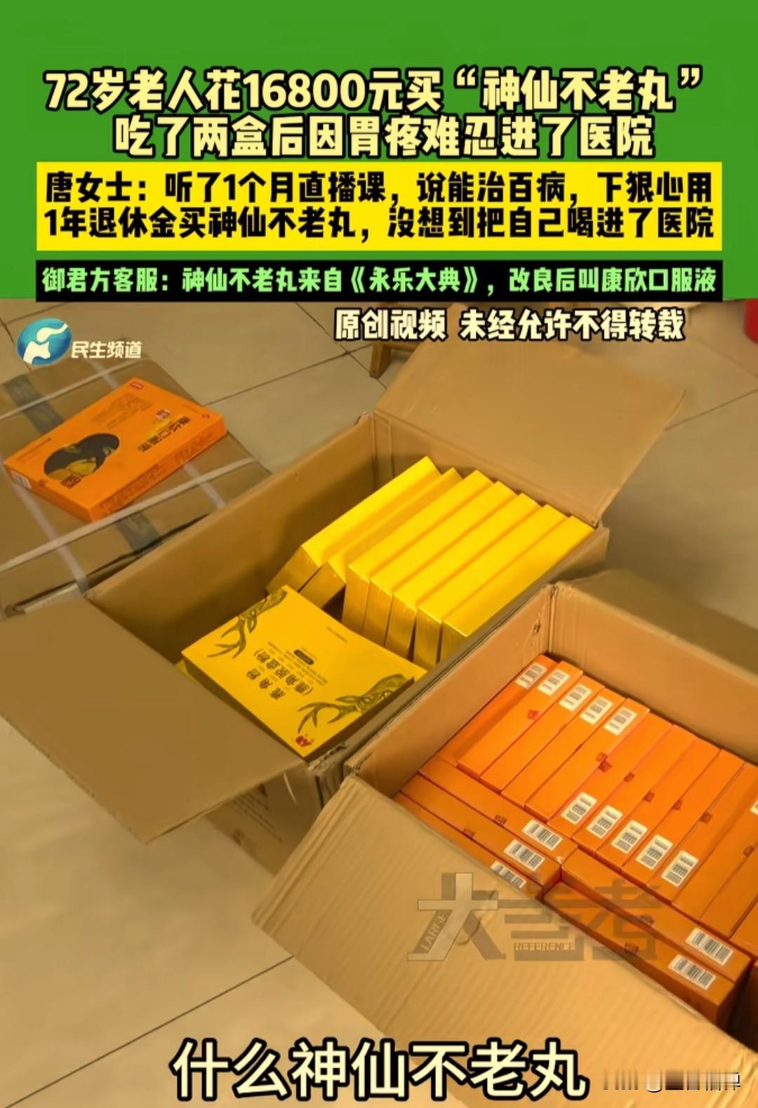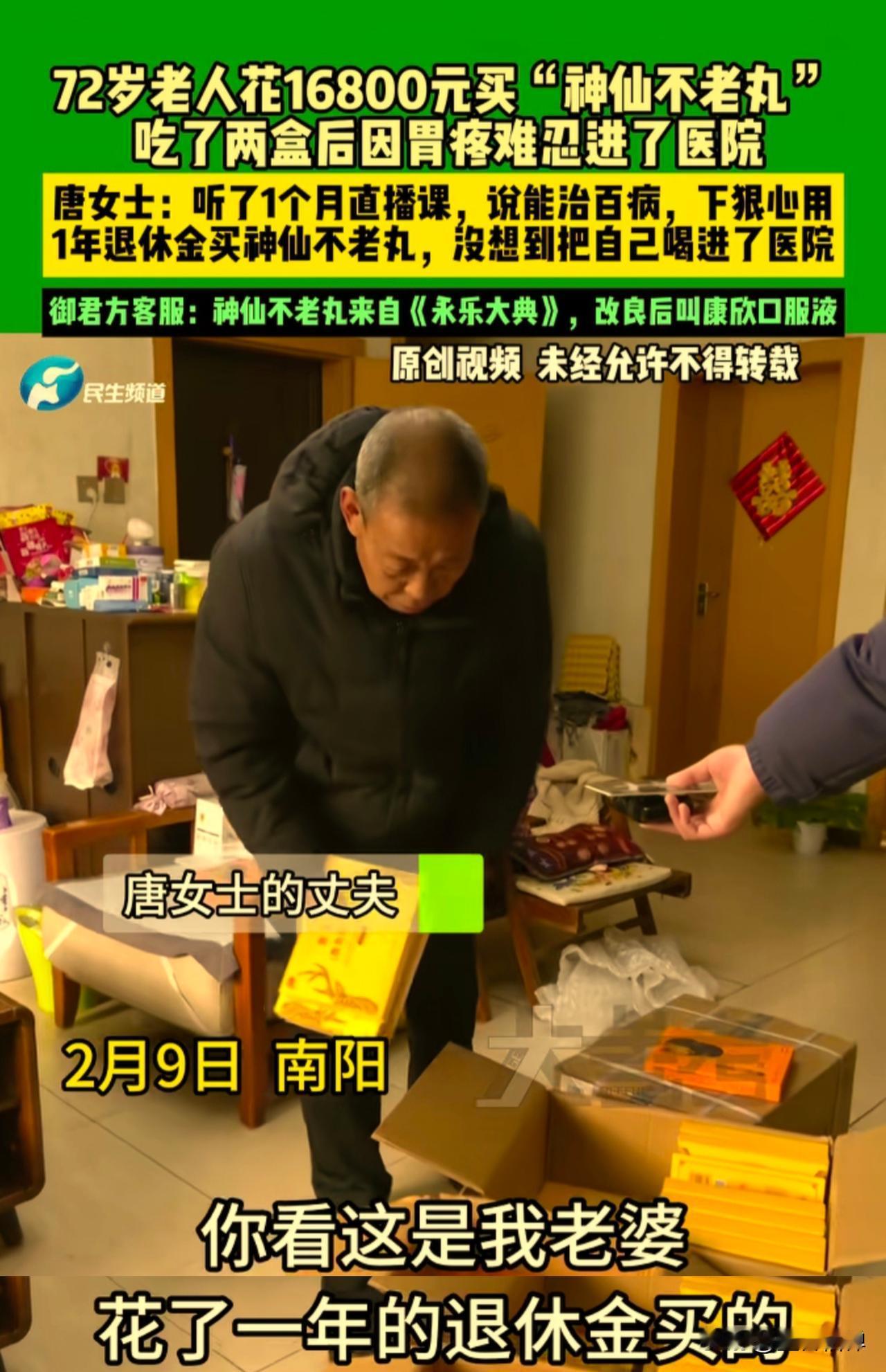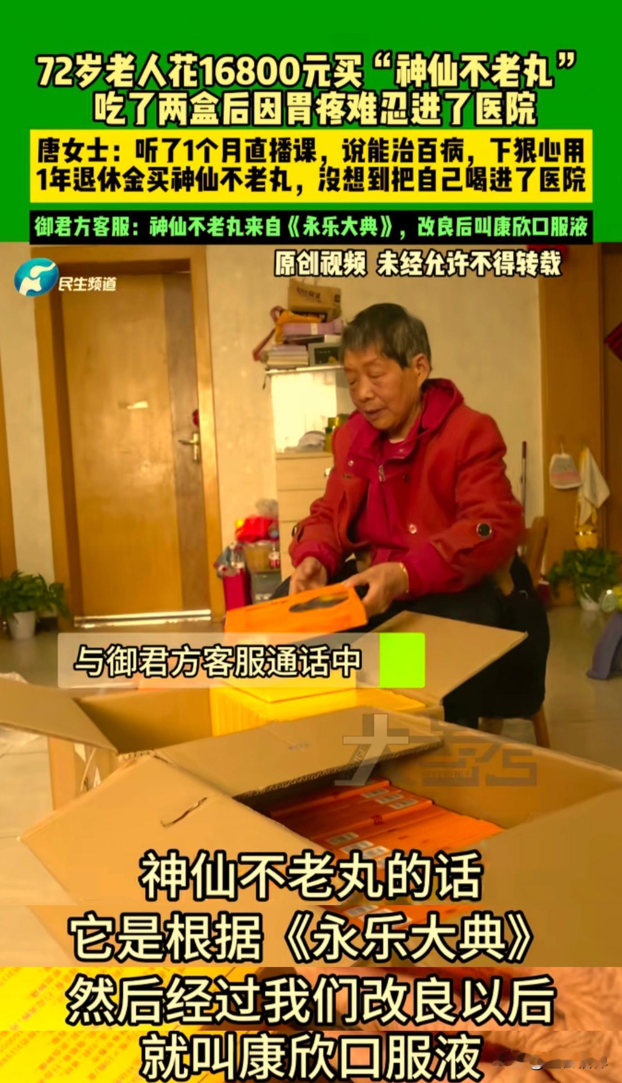 72岁老人花16800买“神仙不老丸”,喝两盒胃疼进医院!商家:源自《永乐大典》 72岁的唐女士怎么也没想到,自己花掉全年退休金买来的“神药”,竟把自己喝进了医院。 2月9日,河南南阳,唐女士丈夫向媒体反映,自己老婆听信直播宣传,花掉一年退休金16800元,买了一大堆号称能“治百病”的“神仙不老丸”,结果喝了两盒就因剧烈胃疼住进了医院。 据的唐女士介绍,她连续听了一个月的直播课,主播将一款名为“康欣口服液”的产品包装成源自《永乐大典》的古方改良神药,宣称能包治百病、延年益寿,号称神仙不老丸,在长期洗脑下,她深信不疑,用自己全年的退休金下了单。 然而,服用一盒后,唐女士就出现了胃部不适,坚持喝完第二盒后,疼痛难忍,被紧急送往医院。 事发后,涉事商家“御君方”的客服仍坚称产品是古方改良,源自《永乐大典》,后经过他们的改良以后,就叫康欣口服液,这属于药品。 记者问客服:“你们现在虽然改名字了,但是你们宣传还是用这么唬人的名字,你觉得合适吗?”。客服回应说:“这个在《永乐大典》上面都有标准的。”。 目前,御君方已联系唐女士,进行退货退款。 防骗提醒: 凡是宣称“包治百病”“古方神药”的保健品,基本都是骗局。 遇到类似直播推销,一定要多和家人商量,切勿轻信。 如已受骗,保留好证据,及时向市场监管部门或警方求助。 来源:河南广播电视台民生频道《大参考》