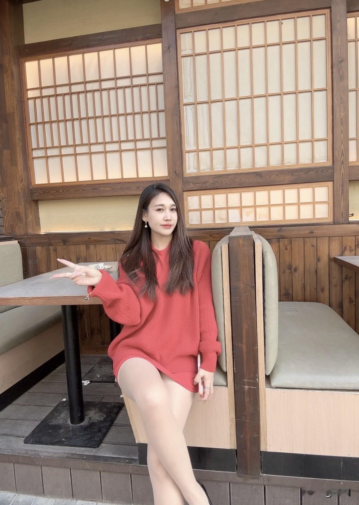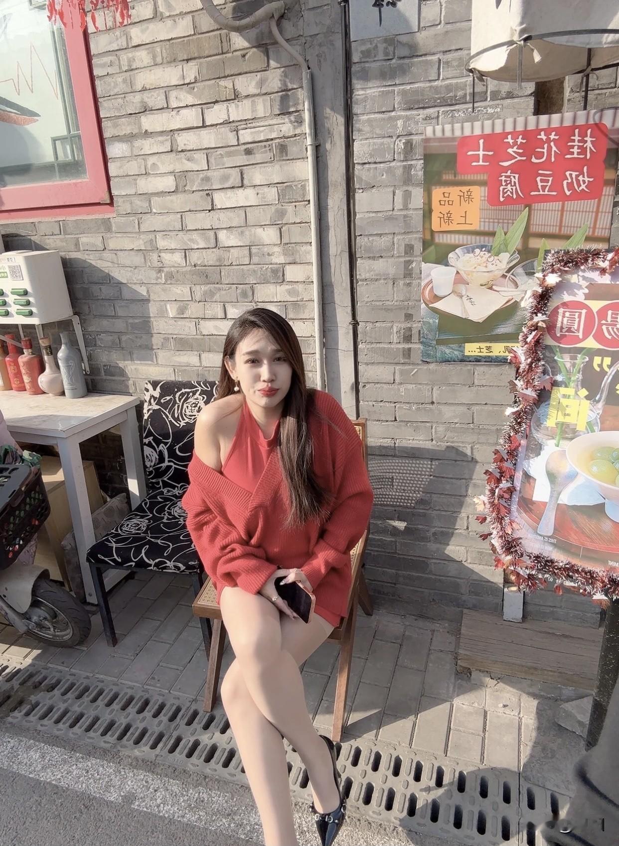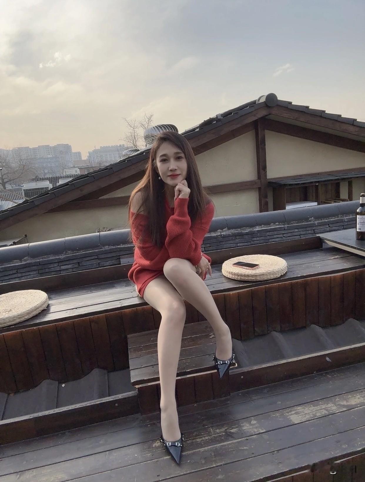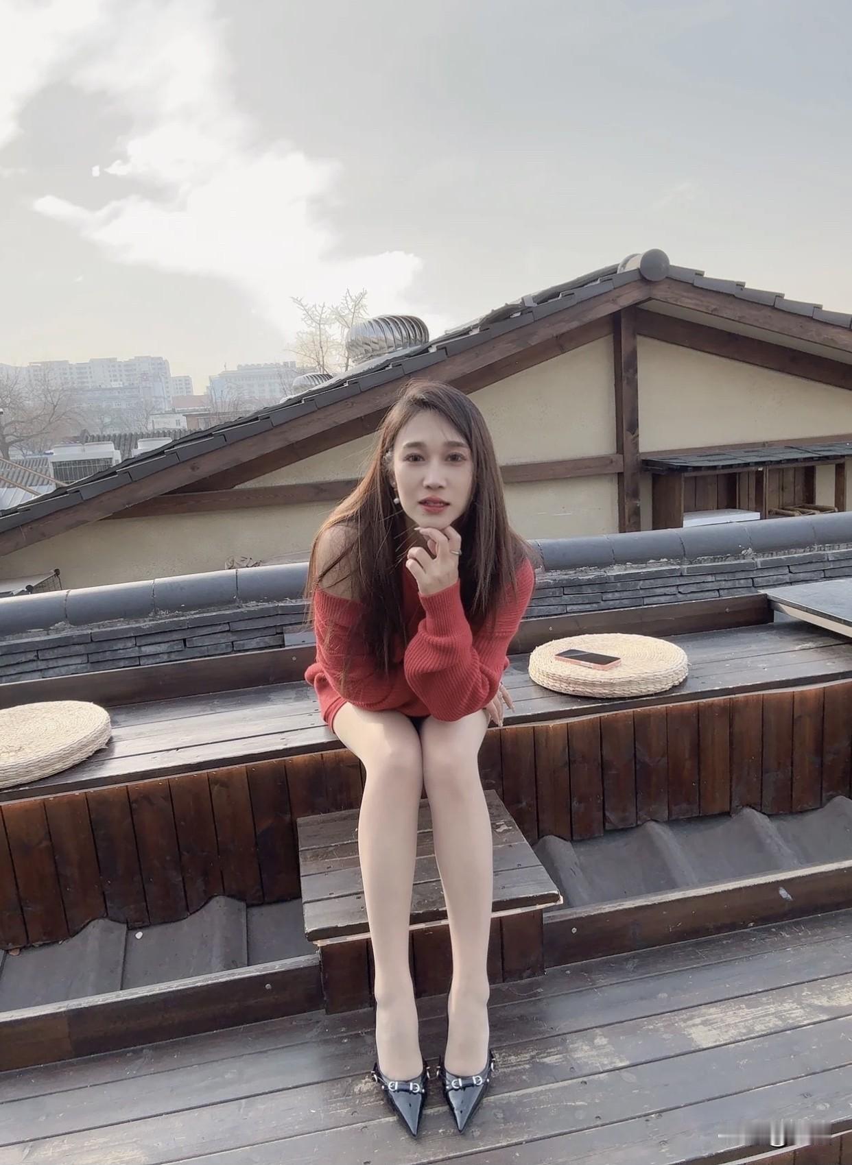 冬日暖阳下的红衣少女,静坐屋顶,享受宁静时光。红衣微笑少女