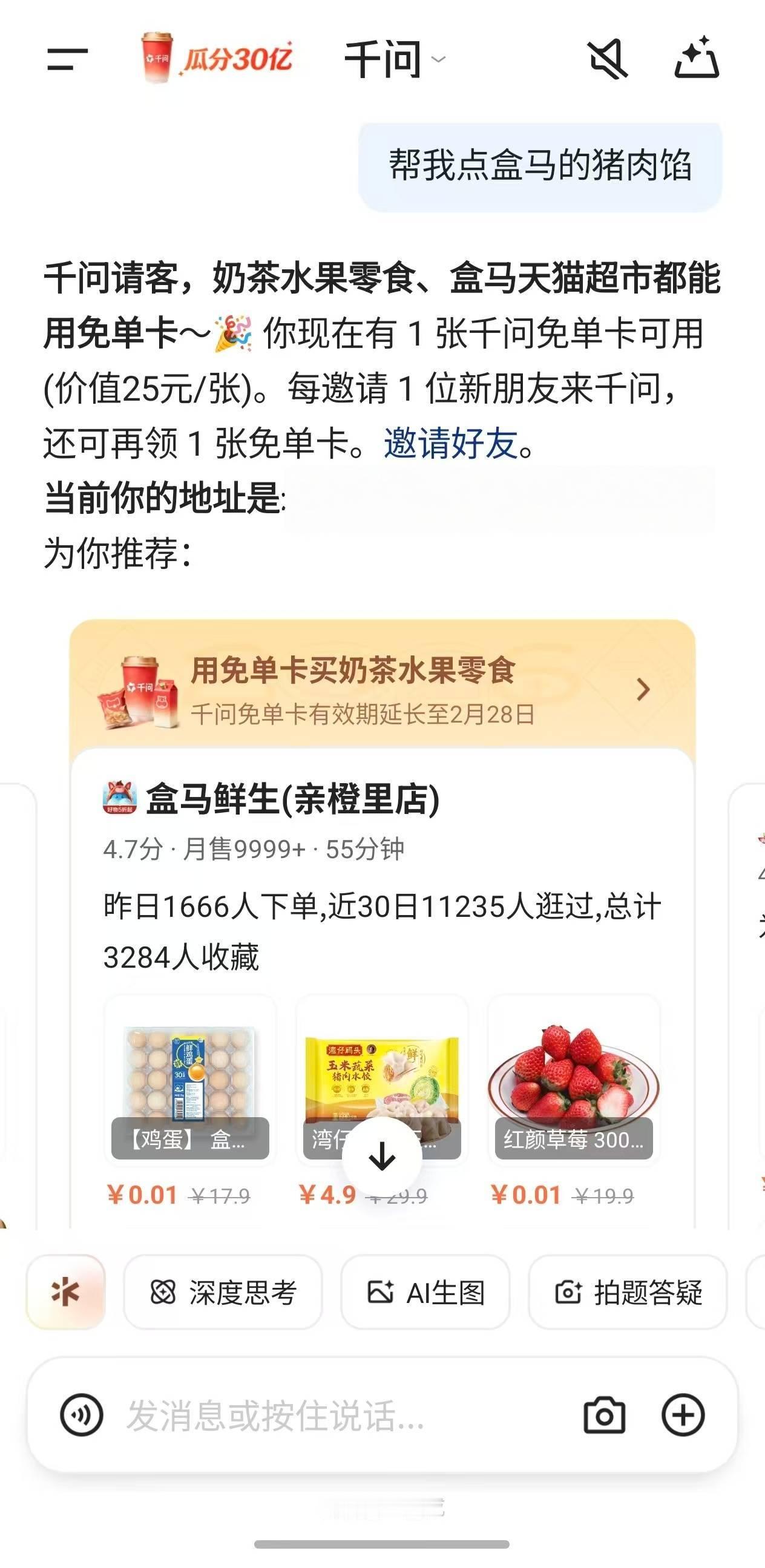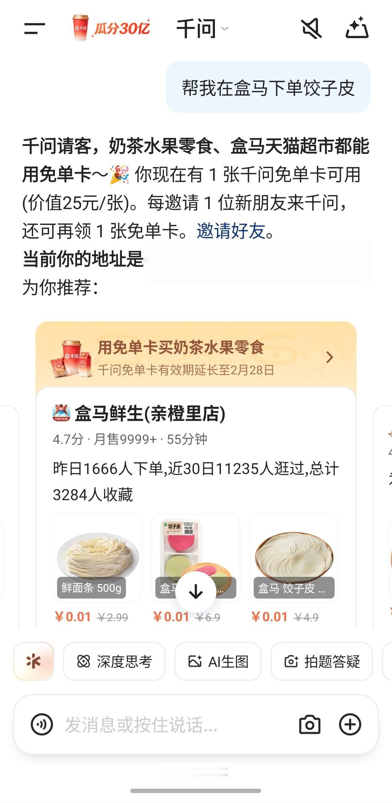 小年包饺子,被我家玩出了花小年用千问加道菜。我们用千问薅的25元免单卡,一人下单饺子皮和菜,一人下单肉馅,三代人同步开包!奶奶的白菜饺、妈妈的玫瑰花、我的兔子水饺……今年全家人的饺子,让千问就给承包了,简直不要太快乐!我要去继续拉新人攒免单卡了,外卖、年货、猫超、盒马都能用,最高20张呢,最后两天了这羊毛必须薅!千问这波,比饺子馅还香!千问免单