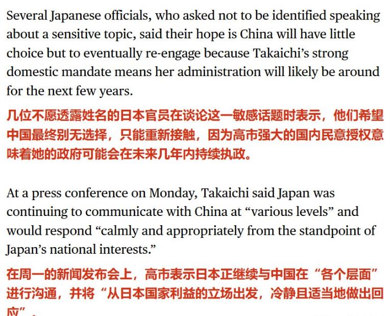 日本人的思维太奇葩!高市胜选后日本从官方到民间的论调都非常奇怪,认为这次“日本的民意选择,会逼迫中国妥协”。 而这种论调不光官方在说,日本民间也有不少人跟着附和。他们觉得,高市胜选是日本全体民众的选择,代表着日本的立场,中国就算不愿,也得迫于“民意”做出妥协,甚至主动让步。 说白了,日本这种奇葩想法,并不是凭空产生的。他们骨子里的优越感和对现实的误判,让不少人都陷入了自我感动的误区,压根没看清当下的局势。 要知道,高市胜选说到底只是日本内部的选举,和中国没有半毛钱关系。中国处理对外关系,看的从来不是哪个国家的“民意选择”,而是自身的核心利益和双方的平等尊重。 而日本官员敢跟彭博社说那种话,背后其实藏着自己的算计。一方面是想借外部媒体造势,向中国施压;另一方面,也是想安抚国内民众,彰显自己的“强硬”,巩固自身的政治地位。 话锋一转,这种自欺欺人的想法,着实让人觉得可笑又无奈。日本似乎忘了,如今的中国早已不是几十年前的样子,根本不会被这种虚无缥缈的“民意”绑架,更不会轻易妥协退让。 然而这样一来,日本这种不切实际的论调,只会让中日关系进一步陷入僵局。原本还有缓和可能的双边互动,或许会因为这种奇葩想法,变得更加艰难。 其实,日本民众之所以会附和这种论调,很大程度上是被误导了。不少日本媒体刻意渲染“中国会妥协”的说法,回避了中日关系的核心问题,让民众误以为局势真的会朝着他们希望的方向发展。 事实上,抛开表面看,这里头其实还藏着日本的焦虑。随着中国综合实力的不断提升,日本在地区内的影响力逐渐被稀释,他们只能通过这种自欺欺人的方式,寻求一丝心理安慰。 这种焦虑带来的误判,只会让日本在错误的道路上越走越远。他们始终不愿正视,中日关系的好坏,关键在于是否尊重彼此的核心利益,而不是某一方的“民意”绑架。 要知道,中国一直愿意和日本和平相处、平等对话,但这一切都有一个前提,就是日本必须放下优越感,正视现实,停止这种毫无意义的施压和自欺欺人。 而如果日本继续抱着这种奇葩论调不放,不愿做出改变,那么中日之间的分歧只会越来越大,甚至可能影响到双方的经济合作和民间交流,最终伤害的还是两国民众的切身利益。 说实话,日本的这种误判,也会影响其自身的发展。在全球化的今天,合作共赢才是主流趋势,一味地自我封闭、误判局势,只会让日本逐渐陷入孤立,错失发展机遇。 说到底,日本是时候清醒过来了,放弃那种“民意能逼迫中国妥协”的奇葩想法,正视中日关系的现实,拿出真诚的态度和实际行动,才是改善双边关系、实现互利共赢的唯一出路。 以上是小编个人看法,如果您也认同,麻烦点赞支持!有更好的见解也欢迎在评论区留言,方便大家一同探讨。