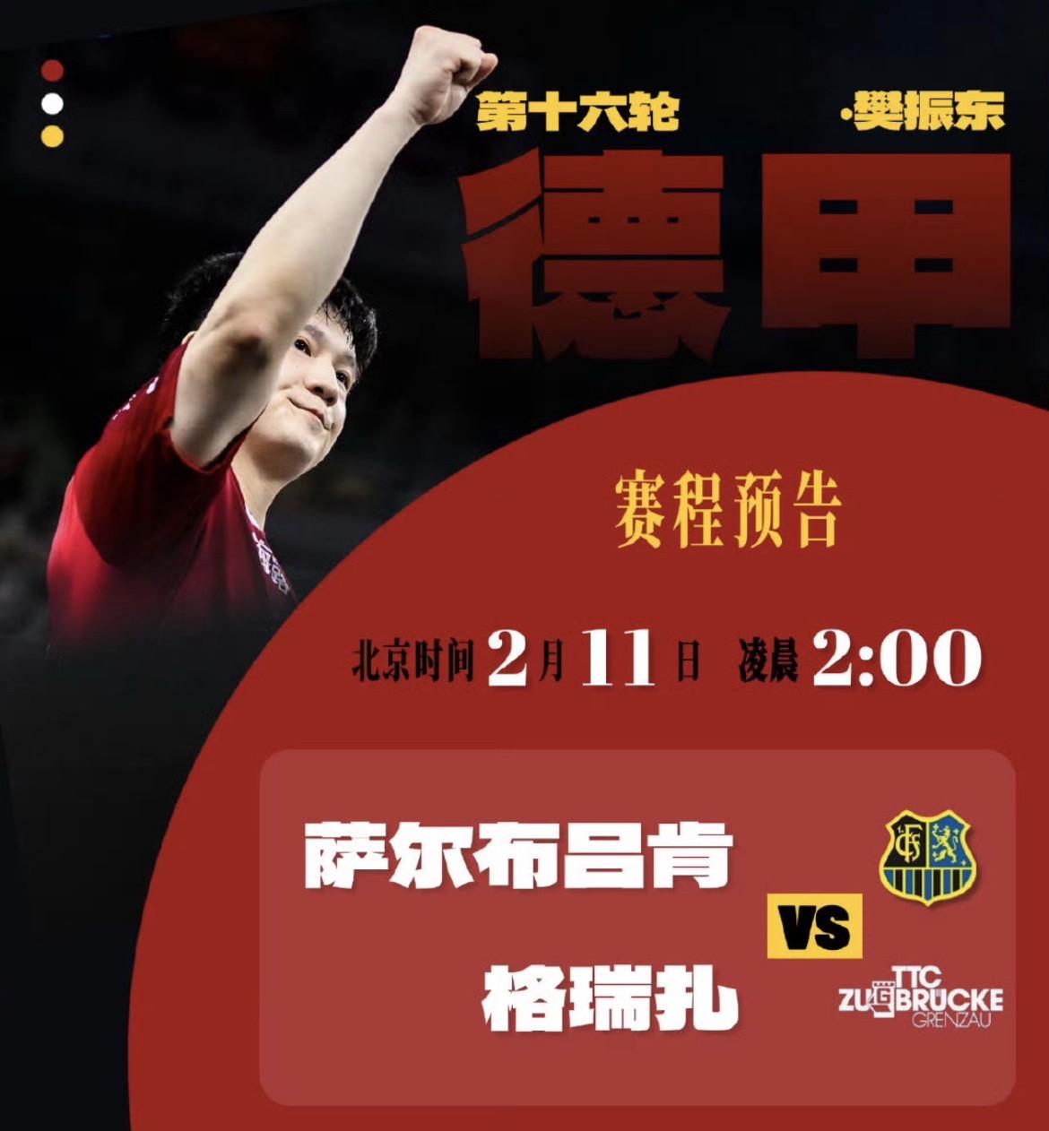 樊振东将于北京时间2月11日凌晨2:00迎来2026年2月的德甲首秀,代表萨尔布吕肯主场迎战格瑞扎队