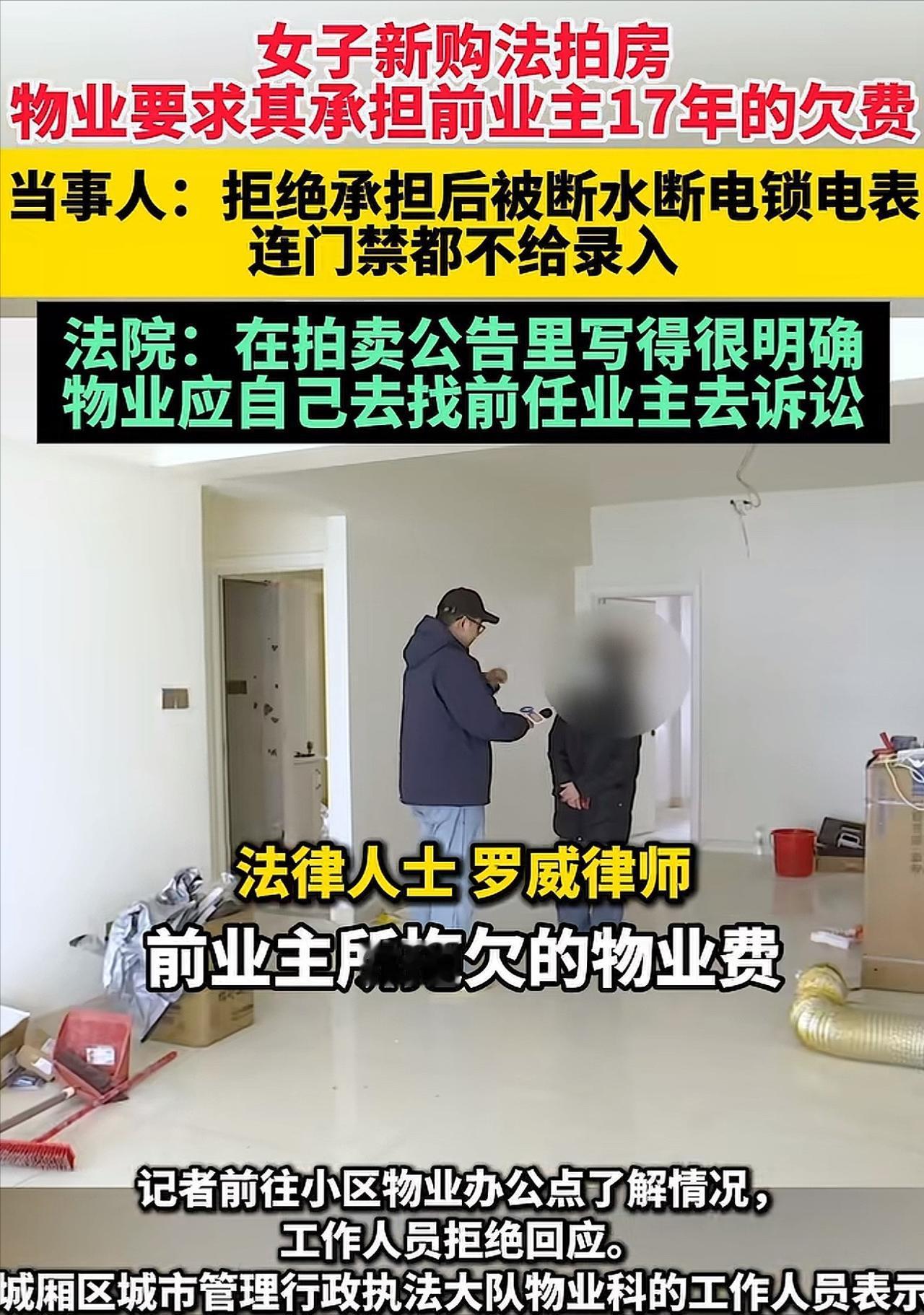 这就是贪便宜的后果!福建莆田,一女子贪便宜拍下一套法拍房子,结果,刚入户,物业就找上门来,让她缴前业主欠下的60000元物业费。   女子不干了,怒怼:前业主欠下的物业费,凭什么找我,法院拍文书可是白纸黑字的写着呢,我只承担前业主欠的公摊水电费!其余和我无关!   物业见女子态度强硬,直接断了水电,门禁不给录入,电表箱也被锁住!女子气愤不已,找来媒体曝光此事!让网友给评评理!   张女士因为经济条件有限,看中了一套价格明显低于市场价的法拍房,户型不错,楼层也合心意,没有犹豫就拍了下来。   过户流程、拿钥匙一切都顺利,原本以为这波省钱操作能安心开启新生活,谁知道刚装修第一天,物业突然上门开口就要6万块,说是前业主欠下了十七年没交的钱。   这个年限吓到很多网友,纷纷表示这就像一个炸弹,藏在房子里,哪天爆出来都能让人吃不消,里面包含了1.3万元的公摊水电,还有将近4万元的物业费。   物业一口咬定“谁住谁交”,态度十分坚决,而且,还有点强势:要么交钱,要么别装修,水电统统掐掉。   张女士当然不答应。她拿出法院拍卖文书,一项项摊开给物业看,明确说明她只需要承担公摊水电部分,物业费应由物业自己去找原业主追讨。   她还指出,物业十几年不对原业主采取任何措施,突然搞新业主,离谱的是连一张正式账单明细都拿不出来,凭什么要她来替这笔烂账买单?   物业显然不愿放手,直接强制断了她家的水电,还不给门禁权限,电表箱锁死,连装修工人都进不去,好几次张女士都气到哭,但对方是一口一个“不交钱就别想过好日子”。   后来在反复沟通下才恢复了供水,但供电到现在都还没完全正常,张女士的生活被彻底搅乱,原本装修计划也不得不暂停。   一个房子变成了彻头彻尾的烂摊子,她始终没搞懂,为什么花了钱买来的合法房产,结果要像讨债一样生活。   眼看事情搞不清楚,她只好借助媒体的力量。媒体介入后陪她和物业谈话,结果物业干脆避而不见,甚至还有工作人员拒绝面对镜头跑走。   记者将整个情况向当地相关职能部门反映后,终于有了结果。   当地住建、市场监督以及法院联合给出明确说法:物业无权要求新业主承担前业主的所有欠费,特别是物业费,必须通过法律途径向原业主追偿。   这么多年不追债,如今不痛不痒地把责任推给新住户,这不是拖了自己工作的后果吗?   根据《民法典》第944条,物业公司不能采取断水断电、限制出入这种极端方式来催缴费用,必须通过催告、诉讼或仲裁。   不论欠不欠,那也得走程序,张女士这波原本只想安安稳稳过个年,结果被当成了靶子。   大家都知道法拍房便宜是便宜,但规则也要讲清楚。   法院早就写明了她只承担哪部分费用,物业费不属于新业主的义务,凭什么让人来补这么一个黑洞?   尤其物业17年都没管,如今一招卡死新业主,说白了是在利用人家的无措和急切入住。   不过话说回来,物业的做法确实站不稳脚跟,如果17年账不清,凭什么再开口找下一任业主追钱,这根本不是市场逻辑,更不是法律逻辑。   现在不是旧社会,有纠纷也不能搞“私刑”,断水断电这样做,只会让自己承担更大责任。   而且账目不公开、不透明说白了也挺吓人的,张女士甚至多次要求提供详细费用表,对方却一再推三阻四,让人怎么信得过?   最后在多方调解下,张女士和物业达成了一个妥协式的协议,她象征性交了三万元,物业终于恢复供水供电,也重新把她的门禁信息输进去,总算能正常装修。   有人反思,这类问题并非个案,背后其实暴露了法拍房接手机制的尴尬,以及我国部分小区物业管理“习惯性懒政”的现象。   谁也不愿意付费维护一个十几年不理账务的系统,但一旦爆雷,谁都想把责任丢给“刚来的那个无经验租户”。   这事说到底,不是谁赢了,而是让人看清了现实:价格低的房子,其实很多时候都绑着风险标签,但就算如此,从法律上、程序上,各方还是得按规矩走。   物业如果真想解决历史欠费问题,更该反思的是这17年里自己干了啥,而不是拿个新业主当“提款机”。   网友说得好:“贪便宜”不是错,不守规矩才是错。