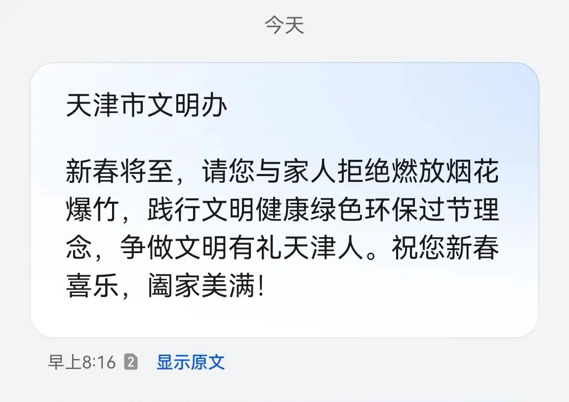 天津市文明办: 请不要给发禁放烟花爆竹的短信了, 因为我们已经从 天津出发回四川的路上了。