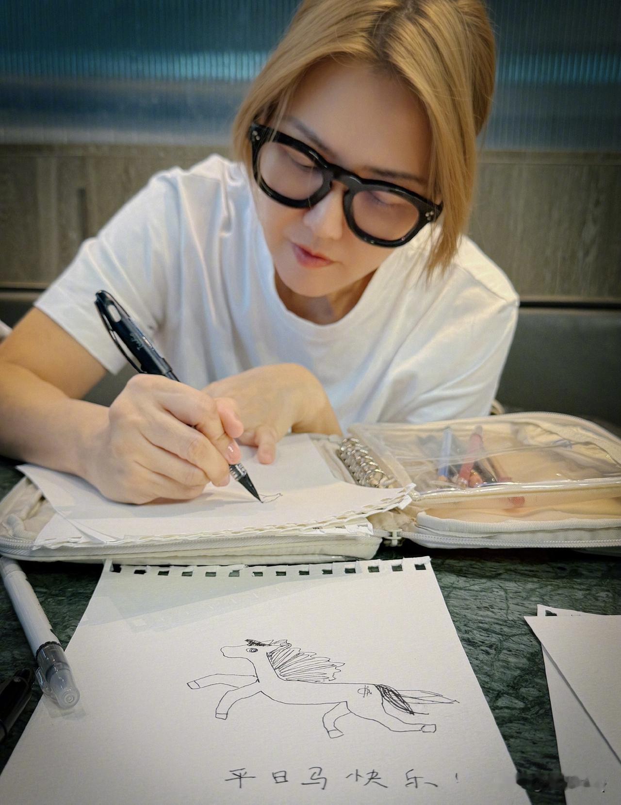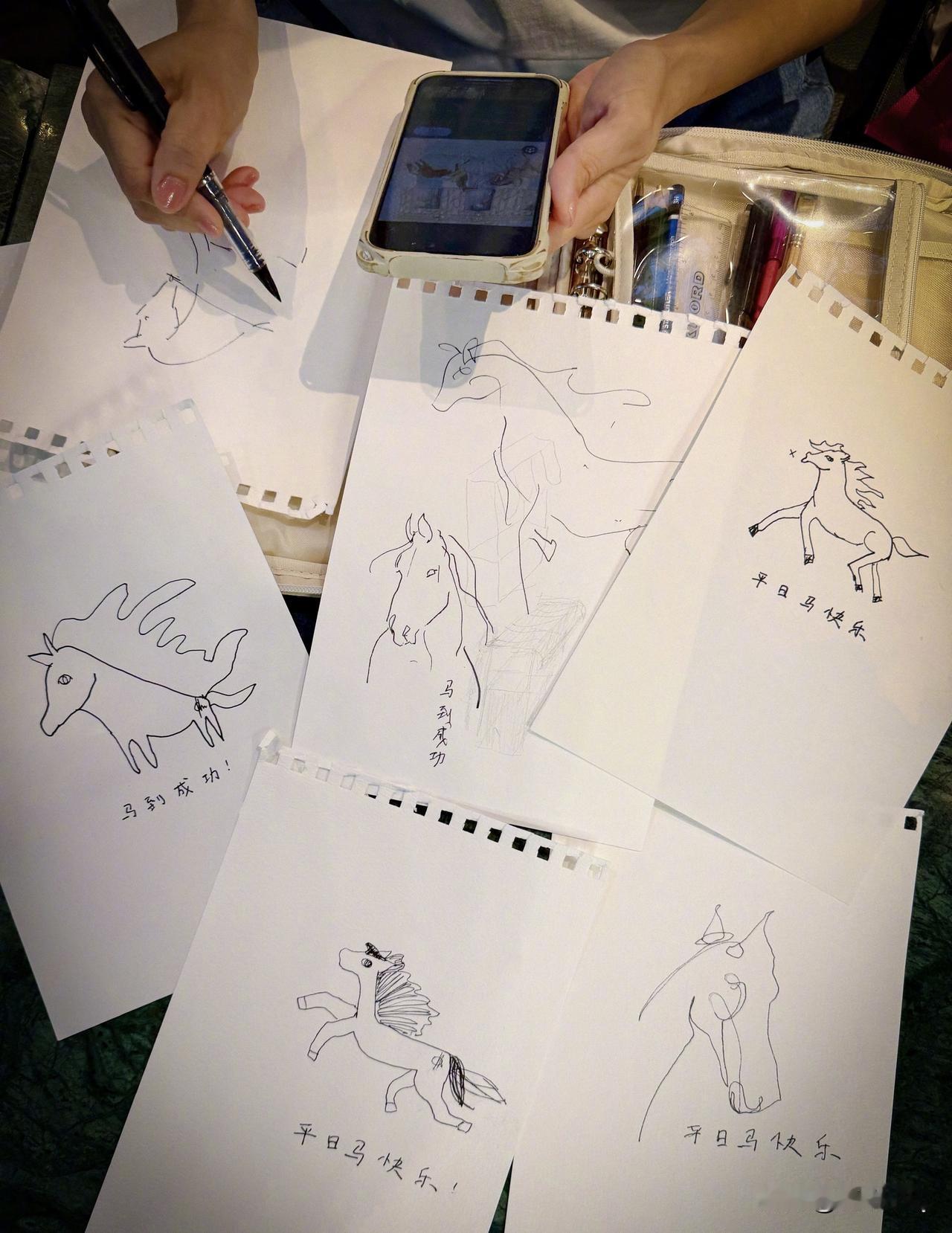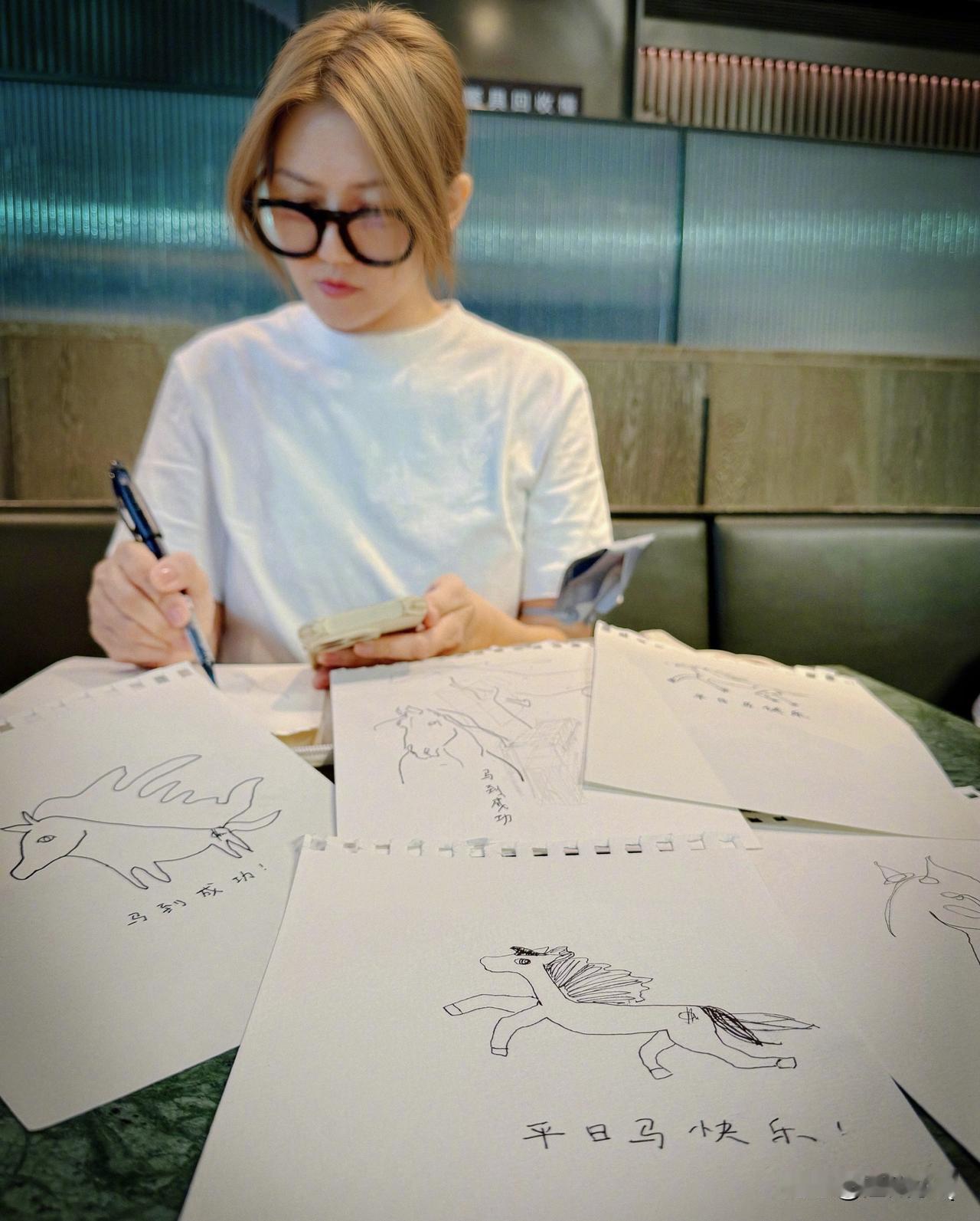 马年到,孙燕姿在很努力地照着画马送祝福。虽然孙燕姿不擅长画画,但有几匹寥寥几笔画得挺传神的。