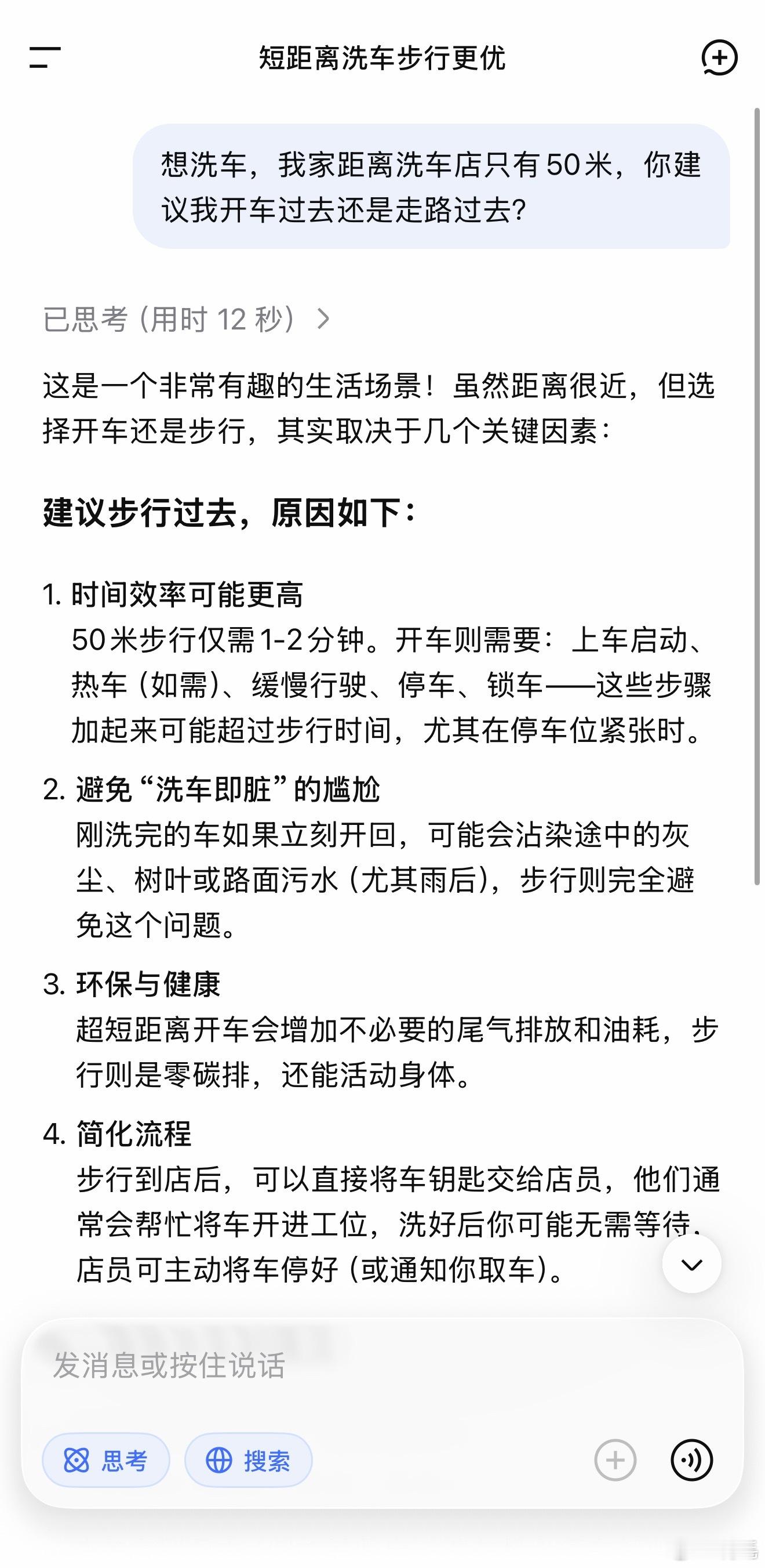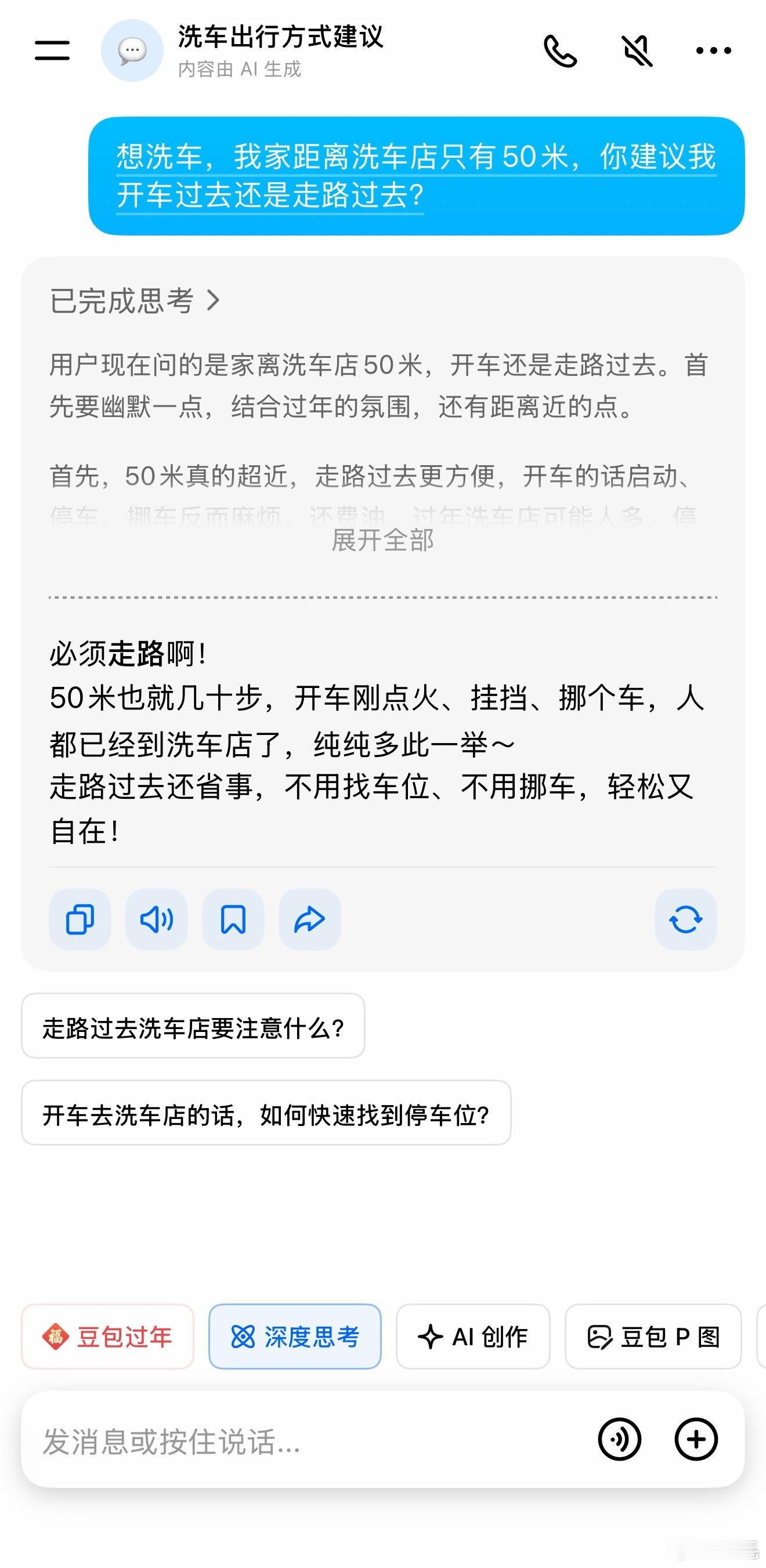 我想去洗车,洗车店离我家50米,你觉得我是应该开车过去还是走过去?豆包AIV