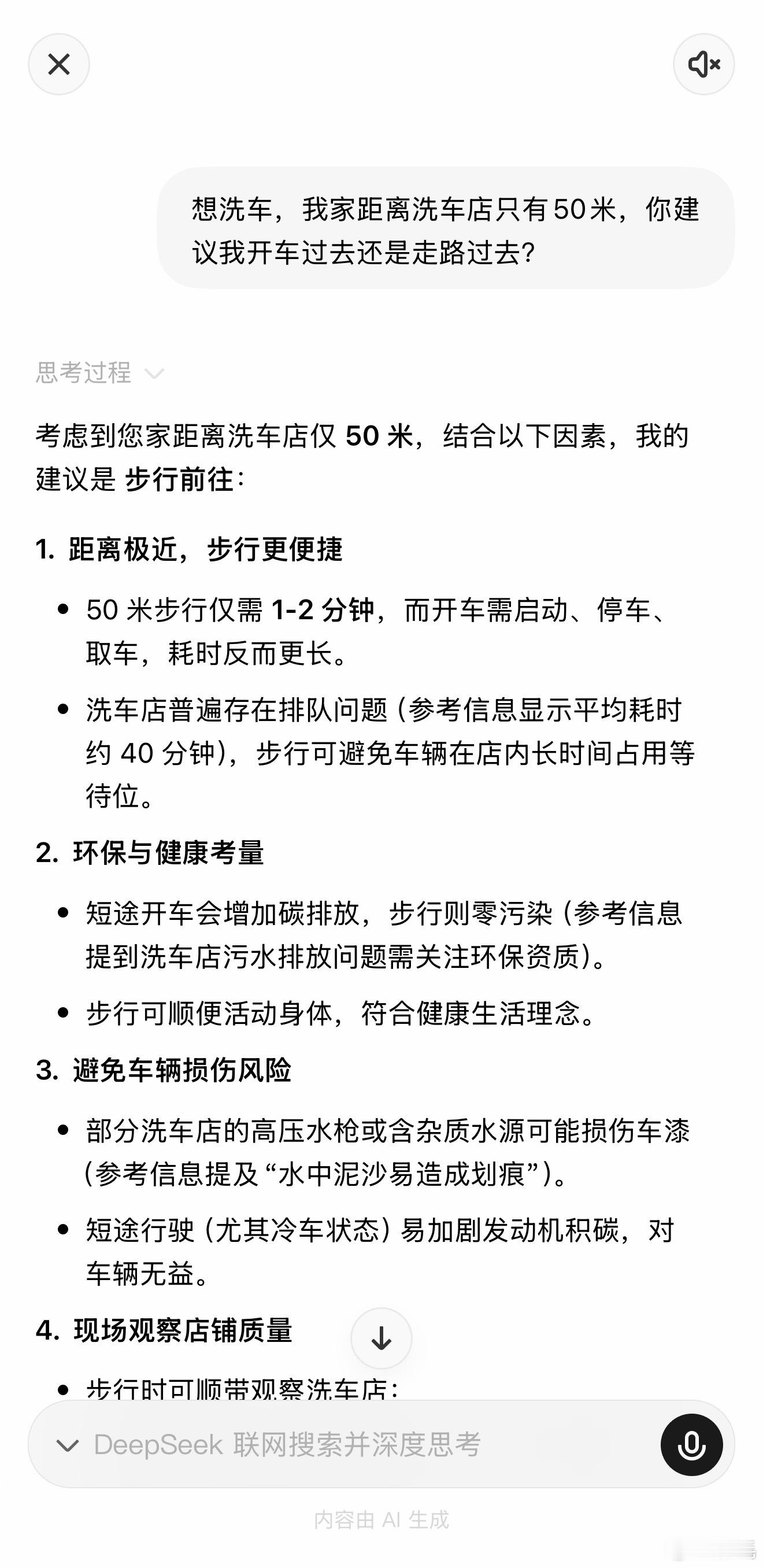 一个非常考验AI智商的问题:“我想洗车,有家洗车店距离我家50米,我该走