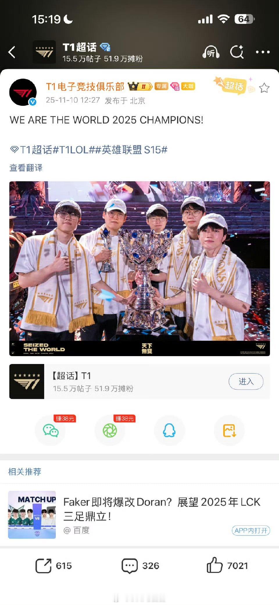 恭喜T1入选微博十大热搜战队,2025年对于T1来说是一个收获满满的一年,虽没拿到LCK的联赛冠军,但也收获了S15世界赛冠军。期待2026年的T1能给粉丝们带来越来越多的欢乐!