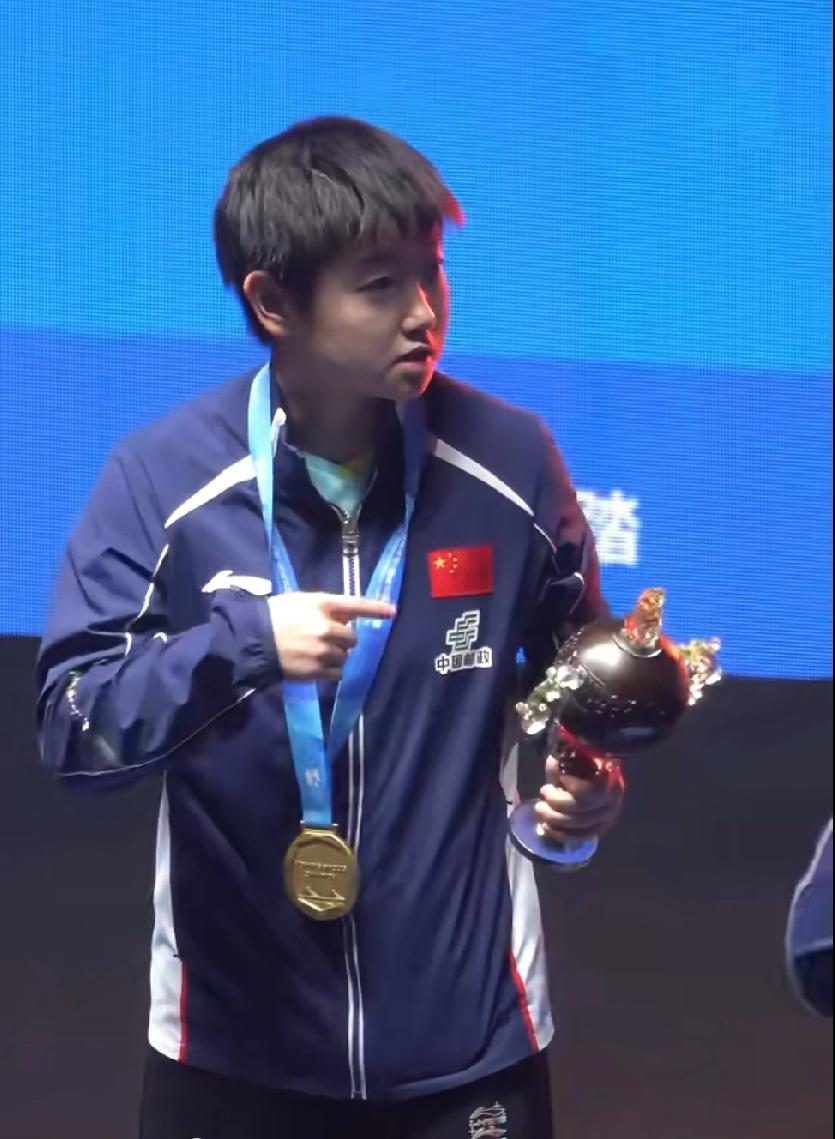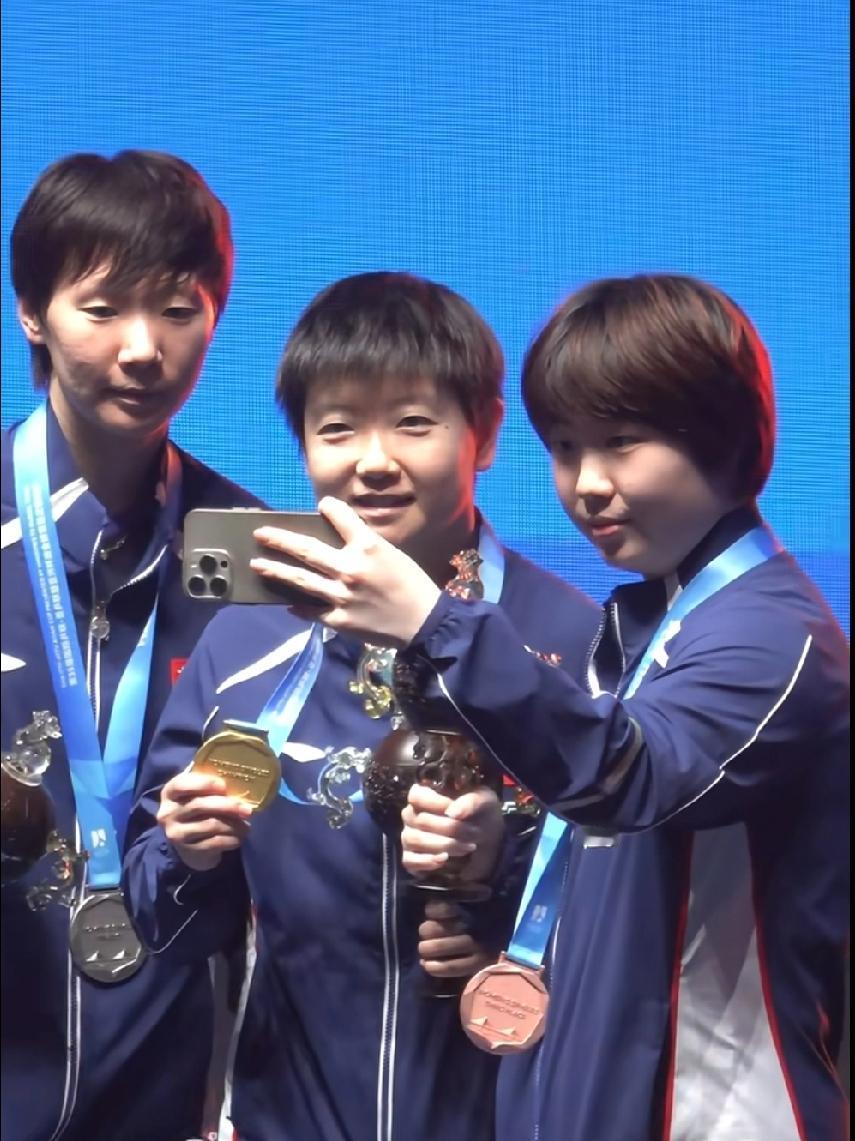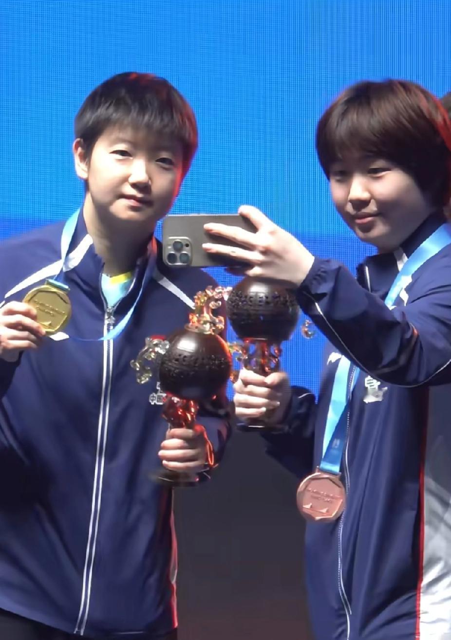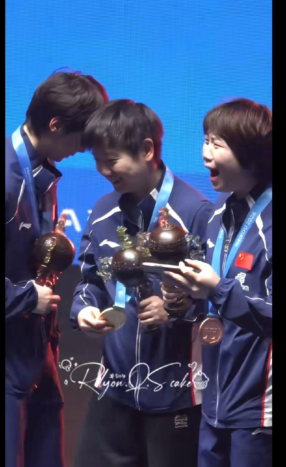 亚洲杯颁奖台名场面!莎莎:哎你们都走了? 亚洲杯女单颁奖台,这一幕真的又暖又好笑! 一开始是蒯曼举着手机,和冠军孙颖莎先来了张自拍,手里的金牌和奖杯都还没捂热呢。 紧接着王曼昱也凑了过来,三人同框,金银铜三色奖牌在镜头前闪着光,国乒女队的排面直接拉满。 拍完照要下台的时候,蒯曼不知道说了句什么俏皮话,逗得莎莎和曼昱都笑开了花,连镜头都挡不住那股子开心劲儿。 等曼昱和蒯曼转身走下颁奖台,莎莎才反应过来,她刚迈上冠军专属的台阶,一回头发现人都没了,那小表情又懵又委屈,仿佛在说:“哎你们都走了?怎么就剩我一个啦?” 这哪里是领奖台,分明是国乒姐妹花的快乐小剧场~ 孙颖莎 王曼昱 蒯曼
