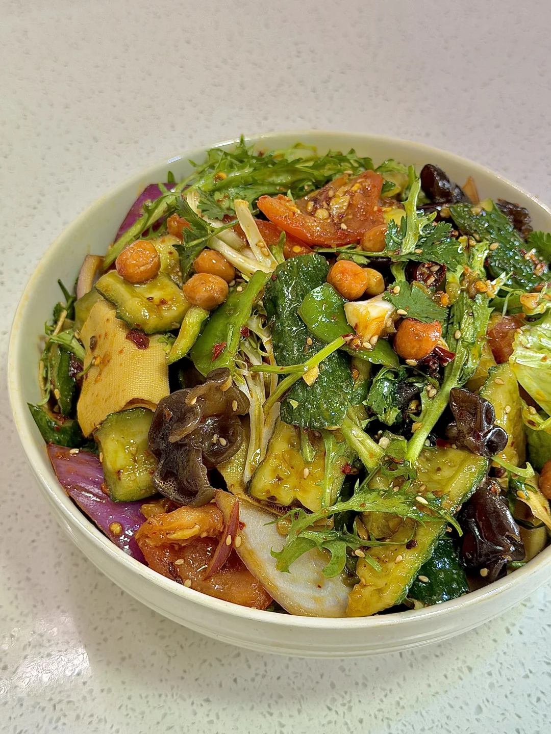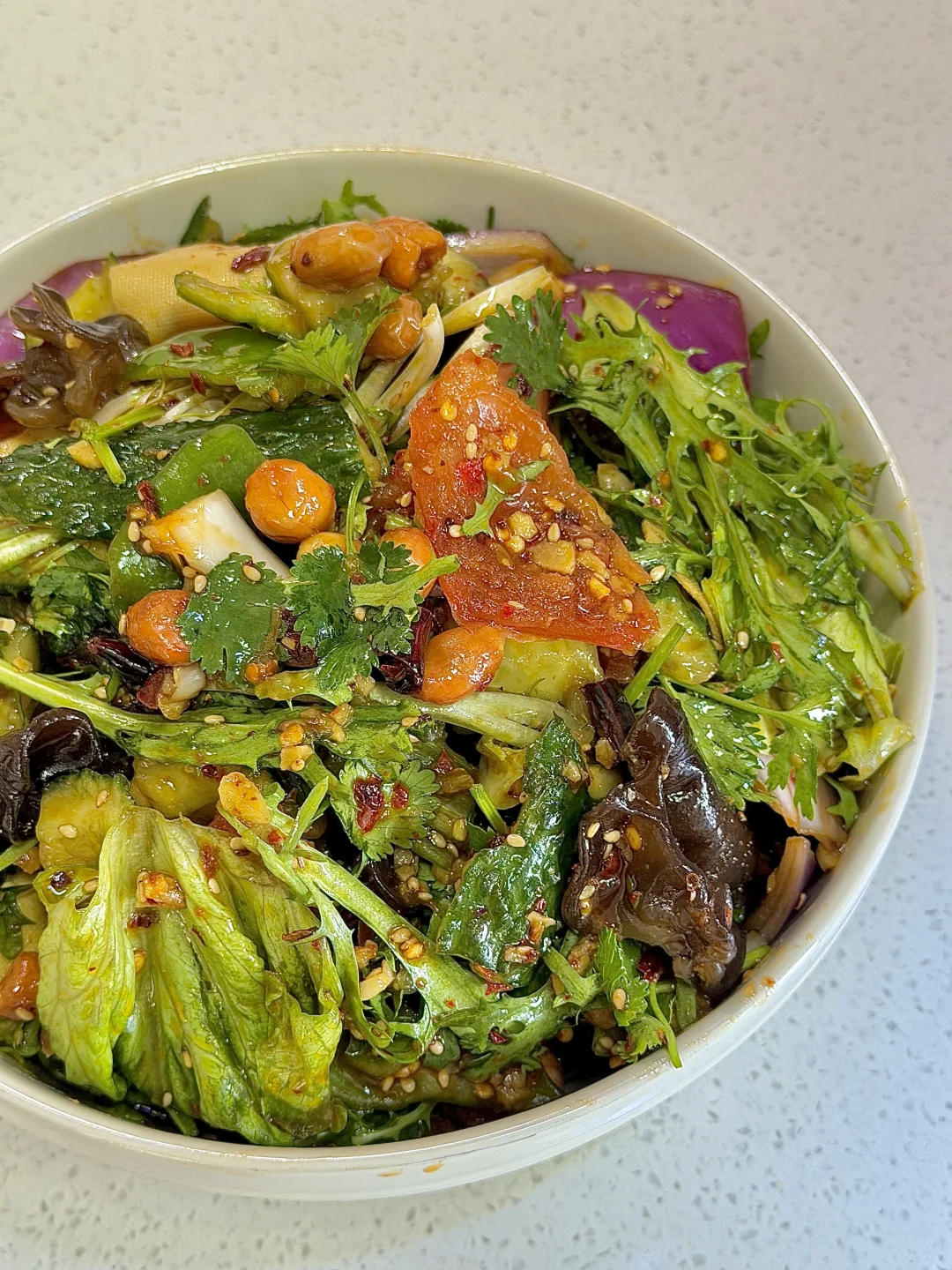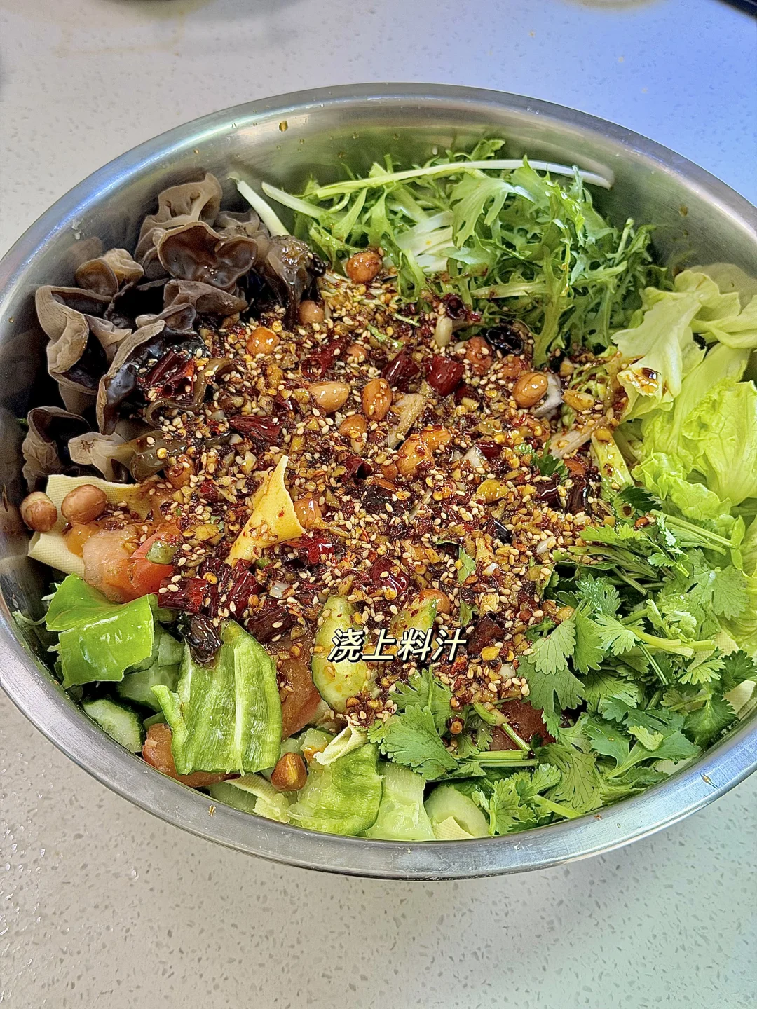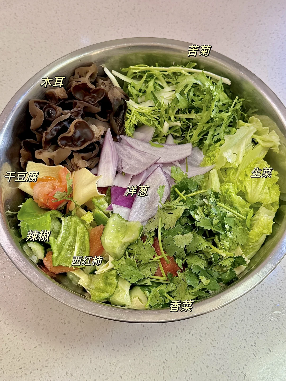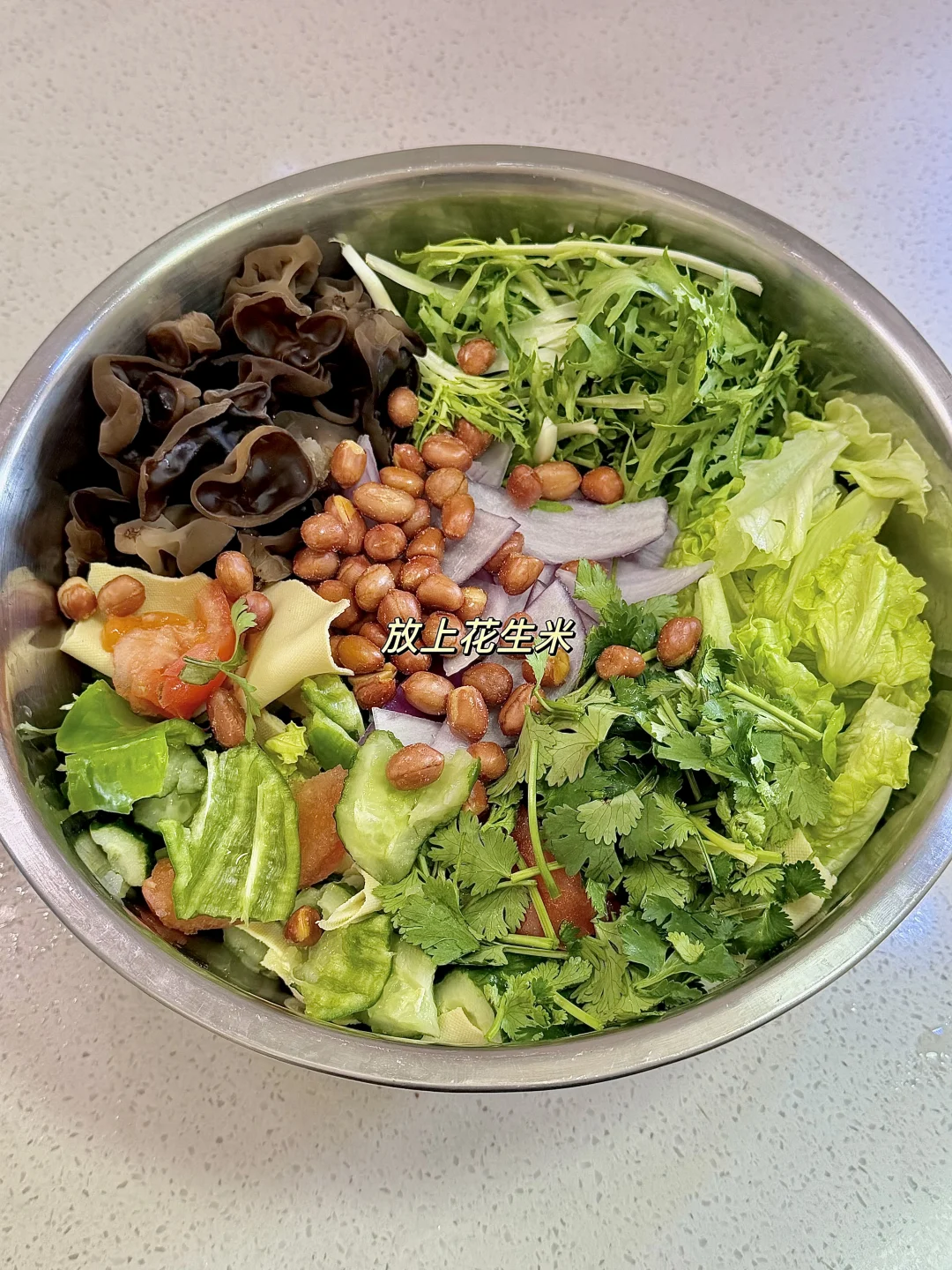 今日份美食分享: 手撕大拌菜 . 食材:木耳 干豆腐 黄瓜 西红柿 苦菊 生菜 香菜 花生米 (喜欢吃什么就放什么) 做法如图上⬆️ . 在烧烤店吃过一次就忘不掉的手撕大拌菜 真的真的巨好吃😋 做法简单,所有食材都手撕 过年大鱼大肉吃够了,就来一盘清爽可口的拌菜吧
