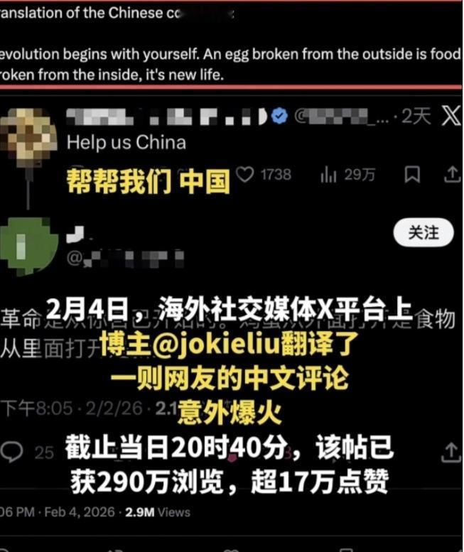 吃瓜吃到自己家了? 这段时间爱泼斯坦事件闹得沸沸扬扬,我们吃瓜也吃得舒舒服服,结果意外不出意外的吃到自己家了。 2026年2月2日,海外社交平台有一句话从天而降不知道扎了多少人的心:help us China!直译就是“中国救救我们!” 以前小红书对账时就觉得有趣,觉得干塌了中美两国很多人的三观,不管是吹的还是黑的都觉得现实有点接受不了。这次就更有趣了,直接呼救了这是? 美国老爷们来求副总统嘴里的“乡巴佬”救命,倒反天罡了?不过面临民生困境、社会撕裂时,人的身体都比较诚实。其实刚刚看到这句话还有点怀疑真实性,毕竟欧美都是“发达国家”,遥遥领先于我们“发展中国家”,一向都是用鼻孔对着我们的。 直到中国网友一句“革命从你自己开始,鸡蛋从外面打破是食物,从内部打开才是新生。”播放量破2亿,才发现低估了严重性,还真的有老外醒悟过来了呀? 西方依赖外部干预的思维早已固化,觉得自己国家有问题解决不了就让其他国家解决。当然反过来也一样,比如异地而处,某国就先是站在道德制高点,大力谴责,再接着顺理成章发兵。不得不说这百年来西方洗脑技术玩得太溜,老外们的脑子像灌了水泥,如果现在不是网络曝光速度快,还不知道会被蒙多久。 不过话说回来,这“鸡蛋哲学”我们看的明白,用常见的鸡蛋就可以把内因外果的关系说得入木三分,毕竟东方智慧重含蓄,讲底蕴,我们每一次苦难,每一步的荆棘都是自己走出来的。那问题就来了,我们就算指引了方向,他们就真的能“自救”?我觉得我们还是继续吃瓜,再磕点瓜子儿,看看事情会发酵到什么地步再说。
