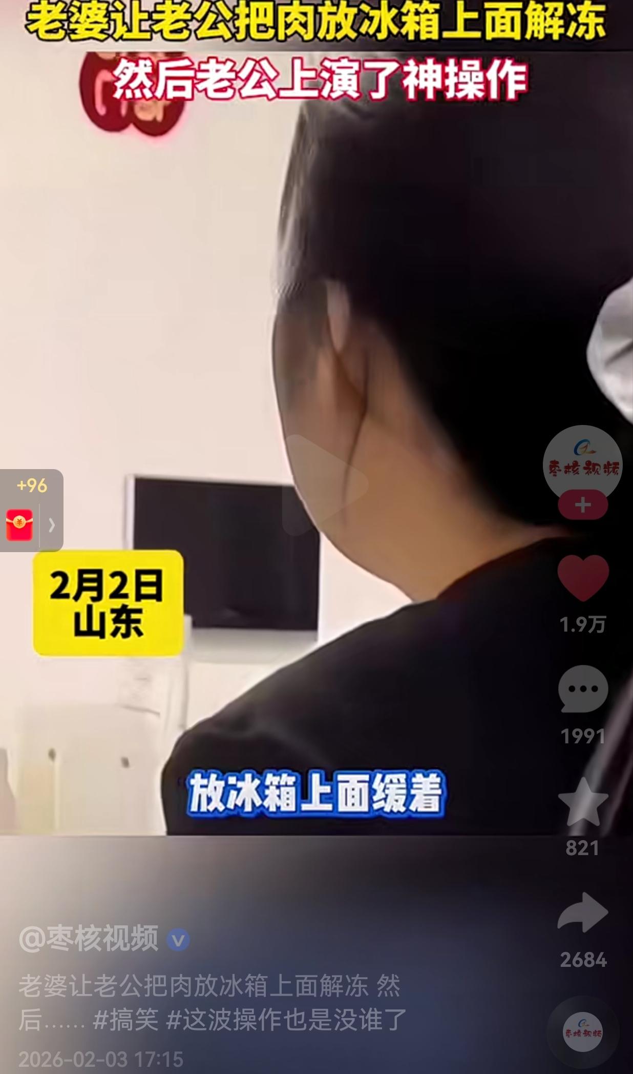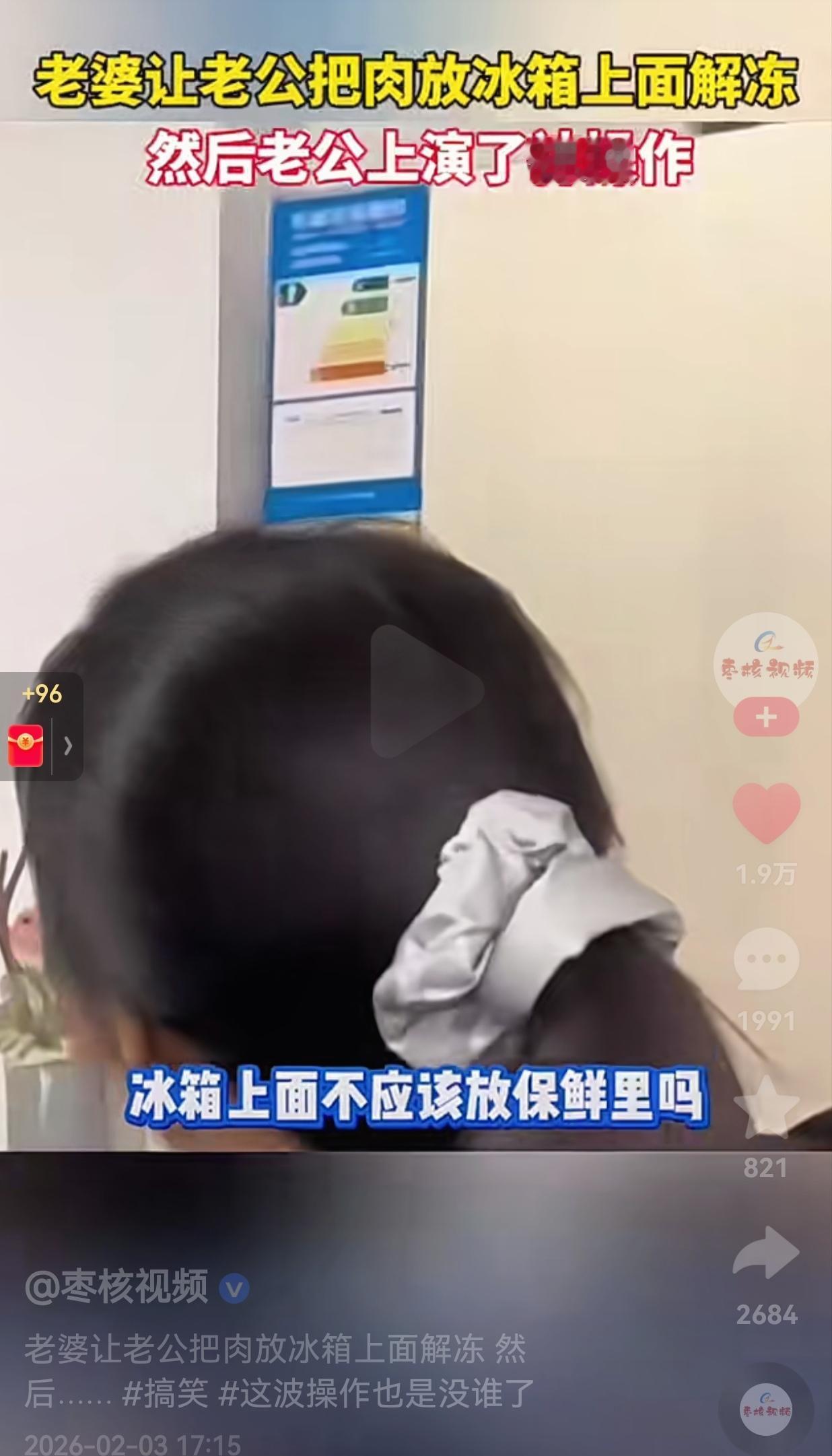 这理解能力真的是顶级!这男人一看在家就是甩手掌柜,没有做过饭,不然,怎么可能听不懂老婆说得言外之意呢? 2月2日,山东的一位女子,让老公把排骨从冰箱下面拿出来,放冰箱上面缓一缓,好解冻,明天好炖着吃。 老公也很听话,听到老婆的命令后,一脸乖巧地答应了,结果等老婆去看的时候,直接给老婆整无语了。 这大哥真的是人才,你看他是怎么做的?他竟然把排骨,完完整整、严严实实地贴在了冰箱的顶盖上! 老婆又气又笑地质问:“我咋说的?让你把排骨拿出来,放冰箱上面缓缓!” 老公还一脸理直气壮:“对啊,我放冰箱上面了啊!你又没说放保鲜里!” 老婆指着冰箱顶:“这是冰箱上!” 老公还振振有词:“你不是说放上面嘛!” 老婆被气到无语:“我要说放房顶去,你还得借800个梯子爬房顶上!” 老公还嘴硬:“你没那么说呀,你要那么说了我不就上去了,都不在这了,我就拿房上了。” 看到这儿,我真的笑死了。这不就是我家那位吗?让他把菜洗了,他能把菜泡在水里泡一下午。让他把地拖了,他能只拖中间那一块。让他把孩子哄睡,他自己先打呼了…… 网友看到后评论说:“这老公是按字面意思执行任务的,一点没偷工减料!” 也有的网友说:“我家那位也是,让他把肉放外面解冻,他能直接放阳台地上,说外面风大,解冻更快。” 还有的网友说:“笑归笑,其实挺真实的。很多时候不是他们故意气人,是真的脑回路不一样。” 要我说,男人不是故意装傻,而是他们的大脑真的是指令式的,你说放冰箱上面,他就真的只能理解成冰箱的物理顶部,而不会联想到冰箱上层的保鲜层。 这不是笨,一方面是因为这个男人没有做过饭,是家里的甩手掌柜,所以,他才会按照指令做事。另一方面是男女思维方式的差异。 那该怎么改变呢?我认为,妻子别再说把肉放冰箱上面解冻,可以直接说把肉从冷冻室拿出来,放冷藏室解冻”。也就是把一个模糊的要求,变成清晰的指令,这样一来,可能就会避免很多矛盾。 当然,偶尔的小失误和神操作也挺好,因为,过日子太过于平淡了,这样一来,偶尔的小拌嘴,还能增加夫妻之间的小情趣呢? 对此,你作何感想呢?