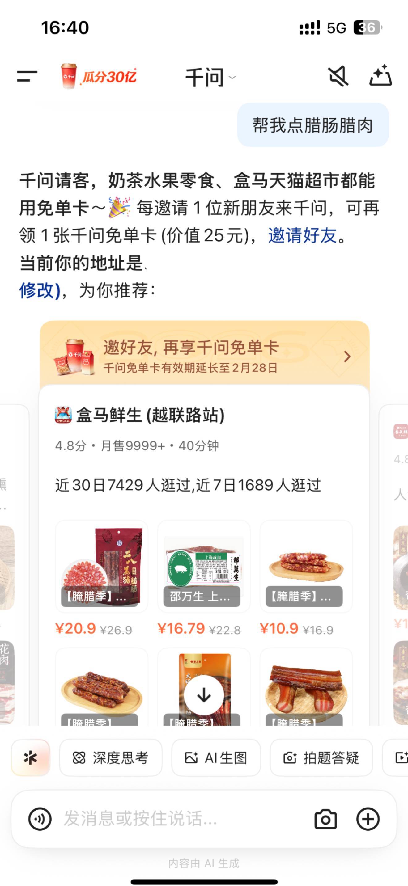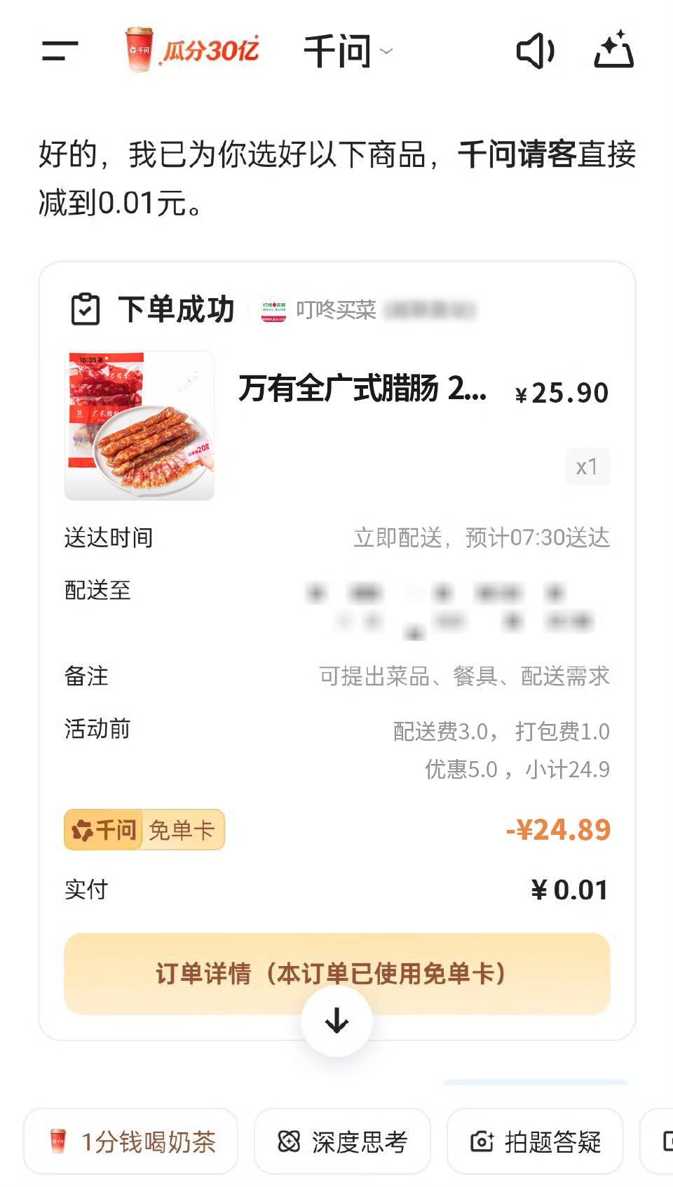 小年全家都出动囤年货了,都说要给家里来点年味,于是就囤了一冰箱的腊味、纸巾、米面粮油......全家互相分享千问免单卡,直接立省不知道多少个25块,我打算拉上好友再领一些,这样领到20张,年货直接爽囤!还是天猫超市盒马通用,挑年货从来没这么爽过!活动倒计时两天,大家赶紧拉新人上千问薅福利,帮你置办年货诚意满满 小年用千问加道菜 千问免单