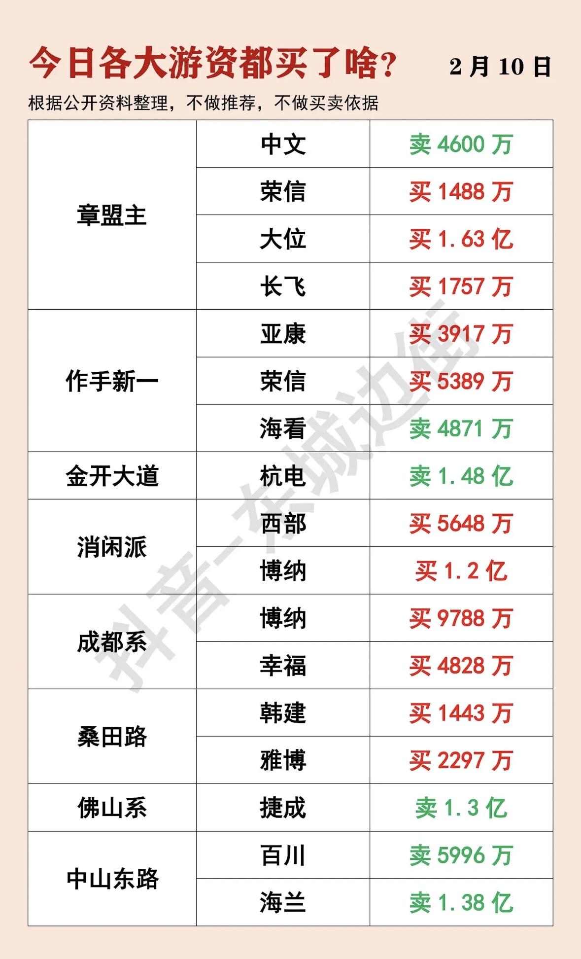 2月10日今日游资动向:章盟主、荣信、大位等大鳄的买卖情况一览! 游资动向:章盟主大买长飞,作手新一抢筹海看,佛山系抛售百川,成都系加仓幸福。