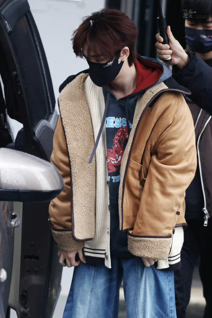 丁程鑫|你好星期六上班路透,棕色皮草外套内搭针织衫卫衣,玩转叠穿时尚!太会穿啦!