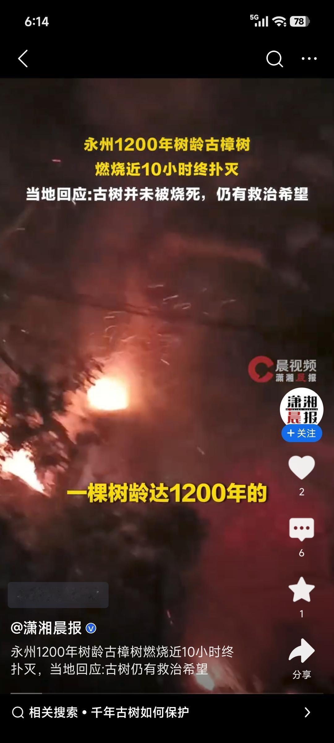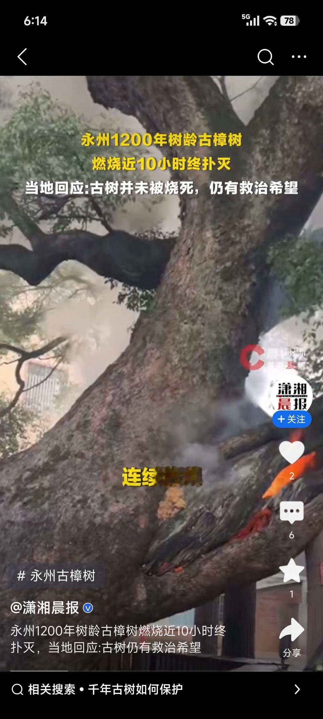 2月9日,湖南道县一棵千年古樟突然起火,那火势凶猛、浓烟冲天。因为树体巨大且树干中空,火势隐蔽难灭,消防和村民奋力扑救,近10小时才把明火扑灭。这棵树树龄约1500年,胸径3.6米,树高16米,树冠冠幅达40米。 树干被烧得焦黑残破、面目全非,所有人都以为它死透了,可它居然还活着!这简直就是生命的奇迹。目前起火原因还在调查,林业局也着手评估损失,会邀请专家确定后续保护方案。这棵古树是村里几代人的记忆,希望它能挺过这一劫,继续见证岁月变迁。
