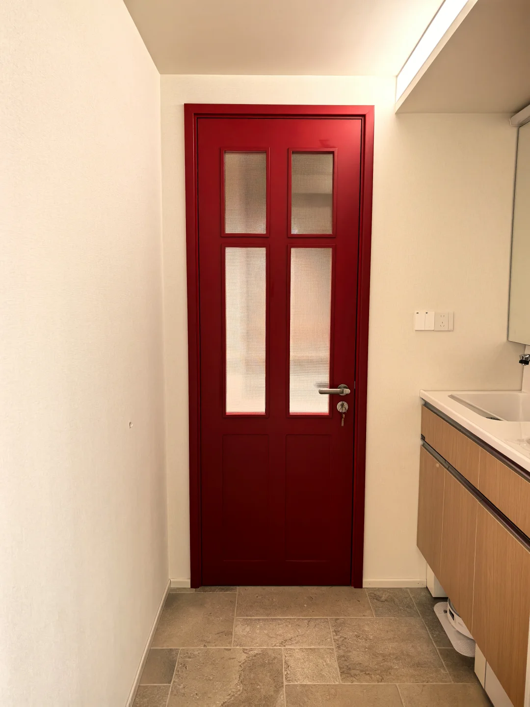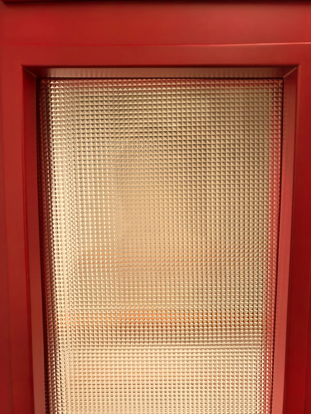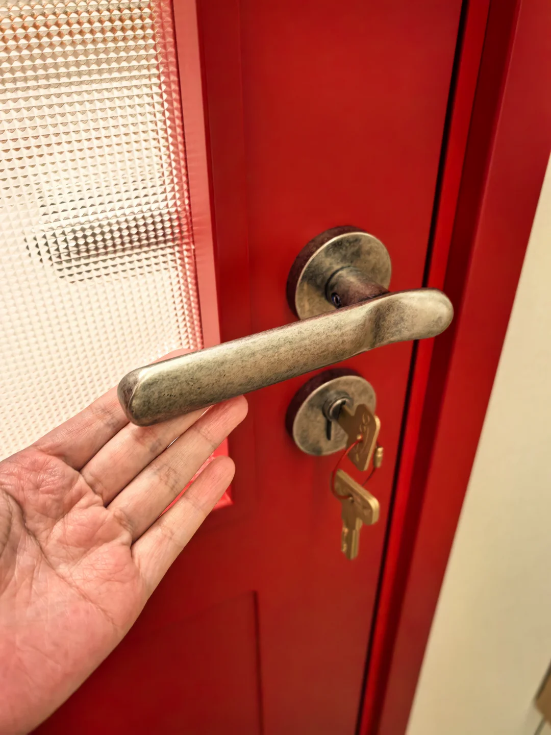 老板说问题解决不了,只要是做这种水晶玻璃的都这样。连展厅的玻璃也是歪的🤷♂️问我要不要换水波纹的,不想换…就是喜欢这种低调的小格子… 有点美中不足 有点心痛 有点逼死强迫症。 但总的来说,这个门在我们家外围是和谐的。漂亮的五金,很正的红色,与绿砖非常相配,和樱桃木的窗台也很搭。 我还能说什么呢,装修就是一场修行,治好了每个强迫症[叹气R]