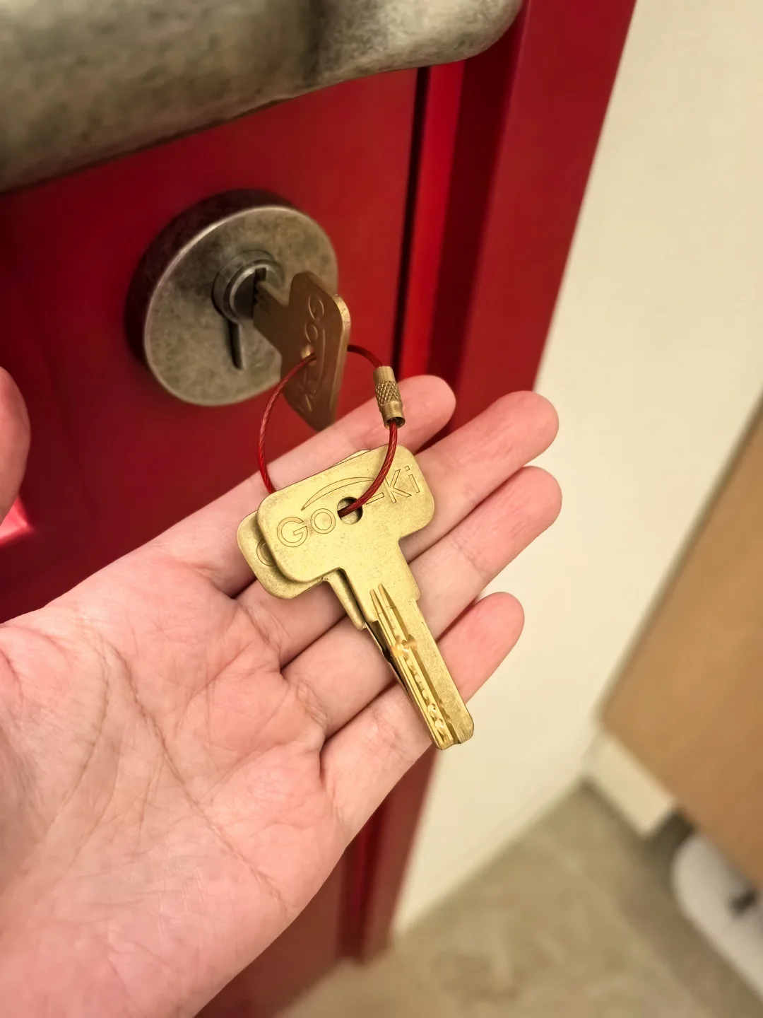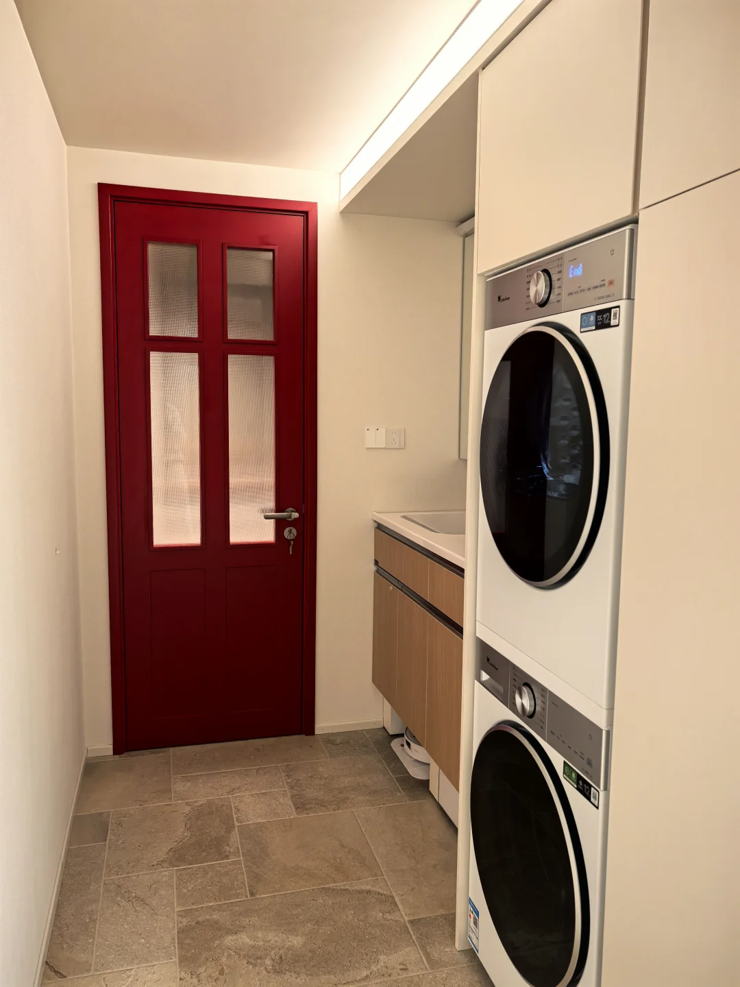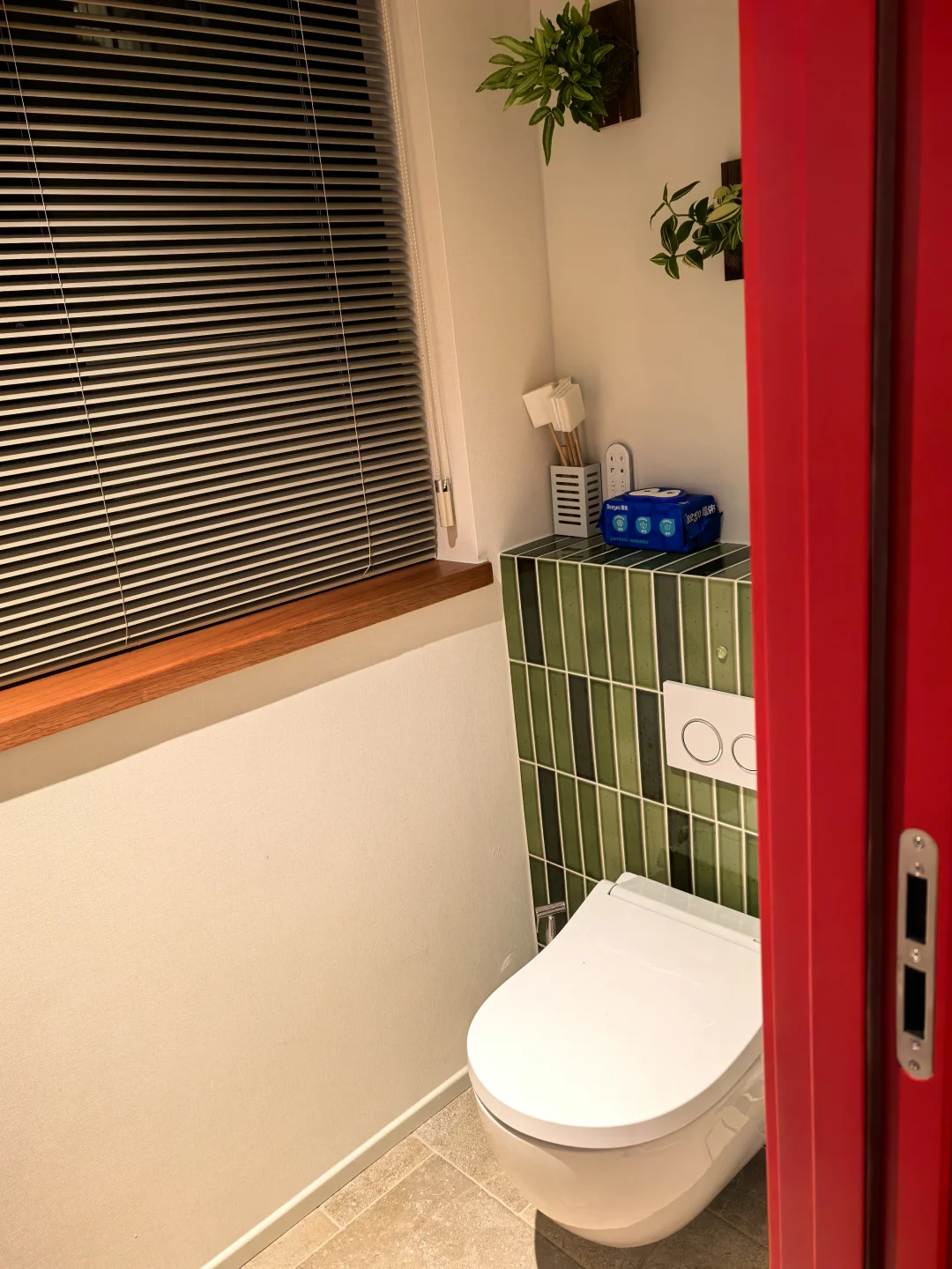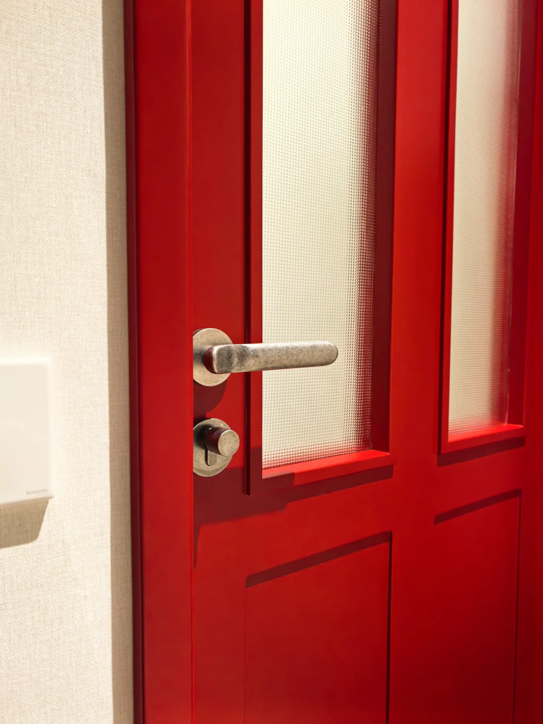老板说问题解决不了,只要是做这种水晶玻璃的都这样。连展厅的玻璃也是歪的🤷♂️问我要不要换水波纹的,不想换…就是喜欢这种低调的小格子… 有点美中不足 有点心痛 有点逼死强迫症。 但总的来说,这个门在我们家外围是和谐的。漂亮的五金,很正的红色,与绿砖非常相配,和樱桃木的窗台也很搭。 我还能说什么呢,装修就是一场修行,治好了每个强迫症[叹气R]