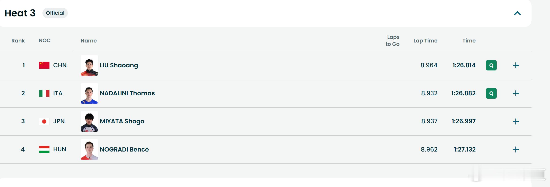 男子短道速滑1000米预赛冬奥会刘少昂第三组第1名,晋级1/4决赛